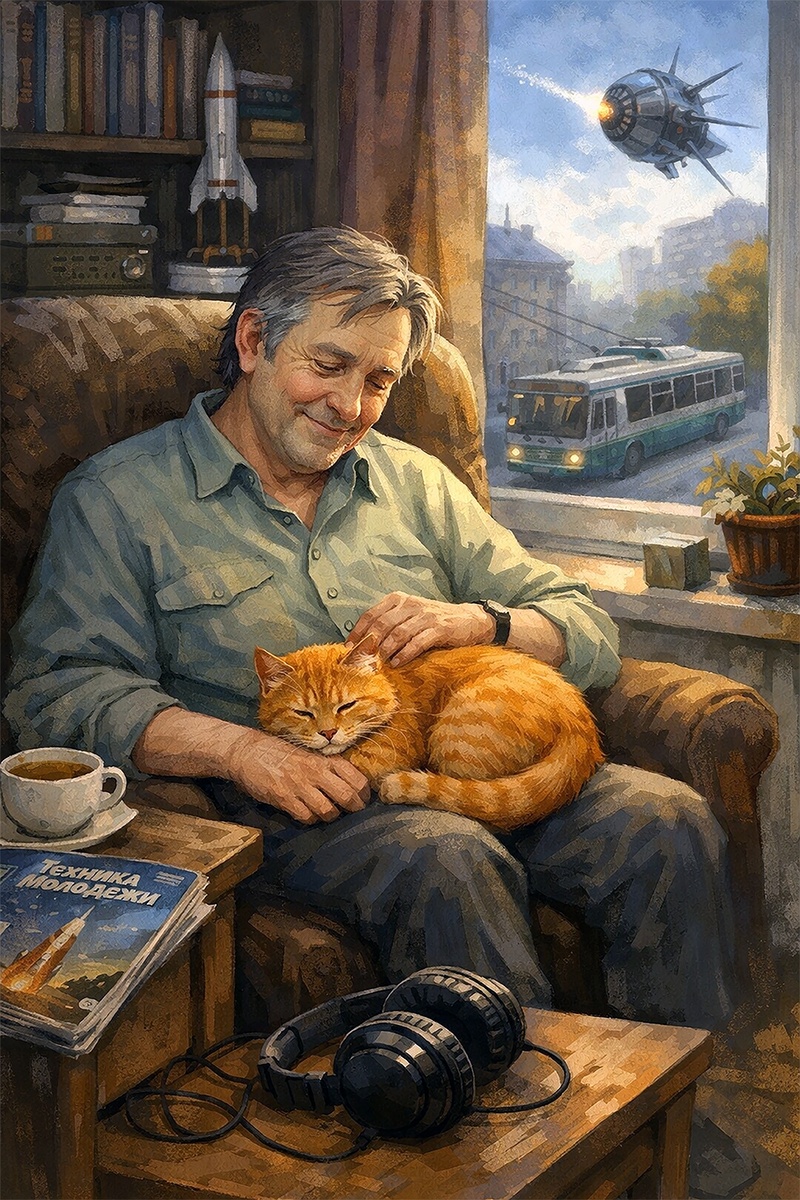 Во-первых, появился кот. Павел Сергеевич назвал его Фомой — за философский склад ума и привычку смотреть в окно с таким видом, будто он знает что-то, чего не знают другие. Во-вторых, Павел Сергеевич перестал сидеть в наушниках сутками. Он, конечно, иногда надевал их, послушать музыку или новые лекции о будущем. Но стоило ему слишком увлечься и полностью отключиться от мира, как кот тут же появлялся рядом: забирался на плечо, лез под наушник или просто начинал урчать прямо в ухо.