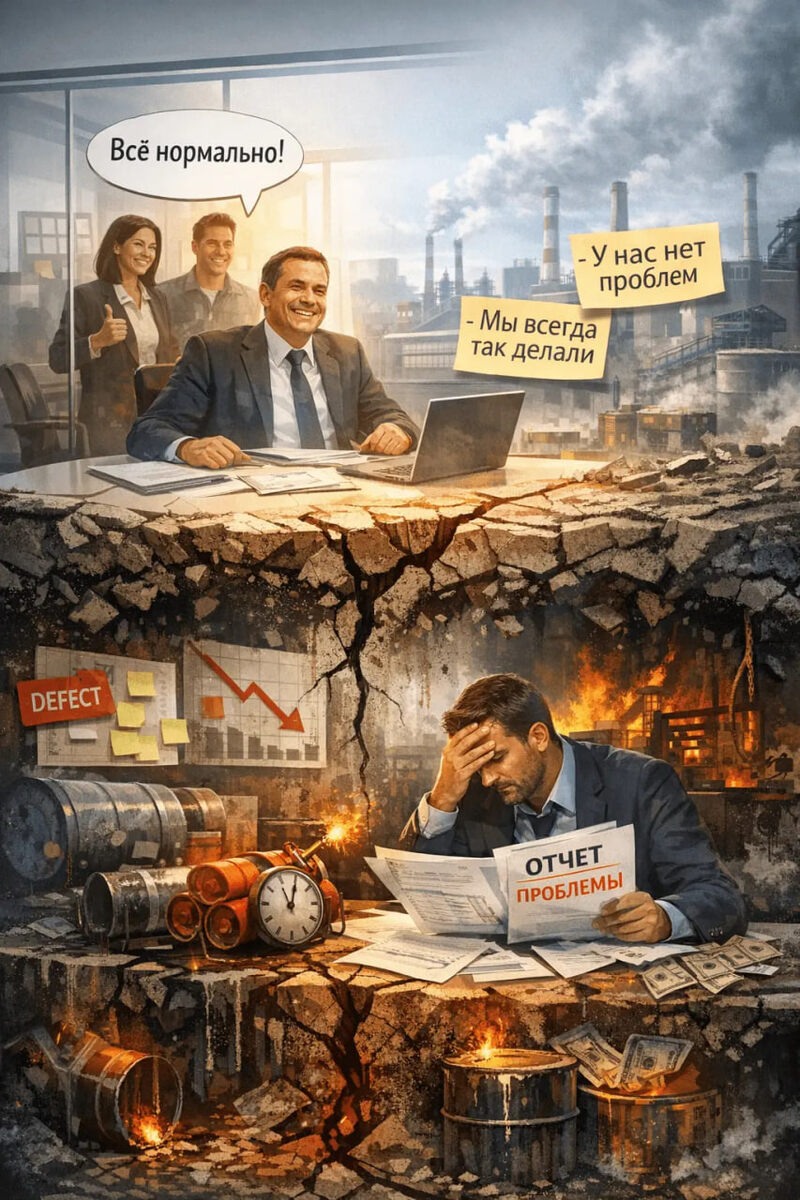 #ДенисРаевский ❗️Самая опасная ситуация для компании — это когда сотрудники и руководство уверены, что «всё нормально». Мы всегда так делали. У нас нет проблем. Это не наша зона ответственности. Начиная переговоры или уже на проекте эти фразы я слышал десятки раз на разных предприятиях — от металлургии и нефтепереработки до сервисных компаний. И именно они чаще всего становятся отправной точкой к кризису. Почему так происходит? Этому есть несколько объяснений. Первое: Потому что люди мыслят шаблонами. Психология устроена так, что мы не замечаем проблем, если они стали частью привычного пейзажа. Производственный брак? «Ну, 3% списания — это нормально». Задержки в поставках? «У нас так всегда» или «Санкции». Низкая вовлечённость сотрудников? «Люди ленивые, с этим ничего не сделаешь», «Таков наш менталитет» (и пожалуй, эта фраза самая страшная из внушённых, т.к. на самом деле наш менталитет далеко не такой). Второе: Средний менеджмент скрывает масштаб проблем из-за страха наказаний, штра