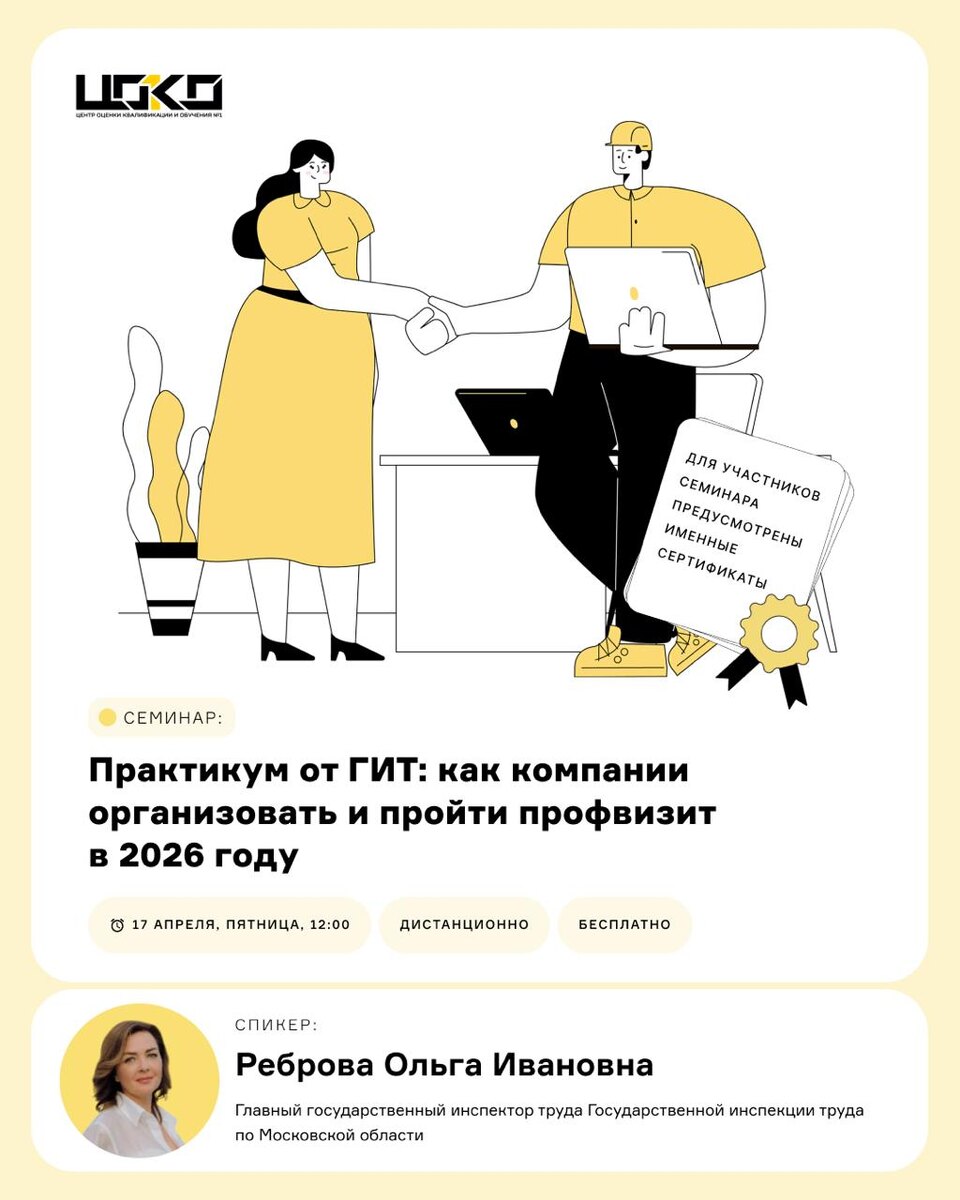 Приглашаем руководителей компаний и специалистов по ОТ на бесплатный вебинар «Практикум от ГИТ: как компании организовать и пройти профвизит в 2026 году». Он пройдет 17 апреля в 12.00 по мск в онлайн-формате. Спикер — Ольга Реброва, главный государственный инспектор труда в ЦМТ ГИТ. Она даст пошаговые рекомендации, как компания может самостоятельно инициировать профвизит, объяснит, поможет ли это избежать плановой проверки, и какие ошибки чаще всего допускают СОТы во время таких визитов ГИТ. Участники в прямом эфире смогут задать свои вопросы. Обратите внимание, количество мест для участия в вебинаре ограничено. 👉 Регистрация на вебинар 🥲ЦОКО №1 в MAX