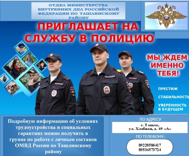 ОМВД России по Ташлинскому району предлагает гражданам один из самых престижных вариантов трудоустройства в настоящее время — это служба в