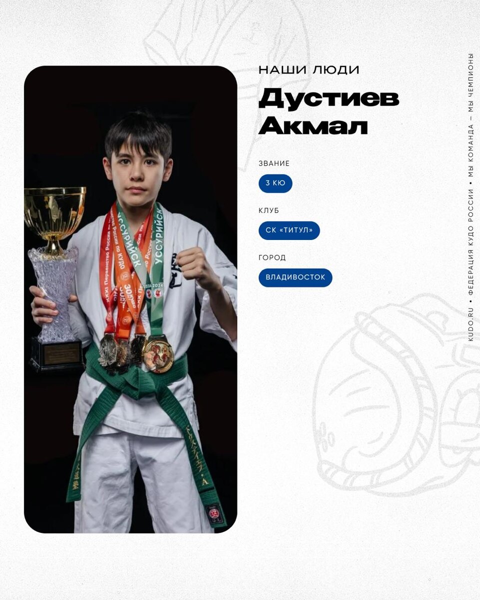 ⠀ 🥋 Дустиев Акмал — 3 кю Чемпион России и лидер по натуре. Признаётся, что проигрывать не умеет. Планирует стать олимпийским чемпионом. Следит за топовыми спортсменами, заимствуя удачные решения и приёмы. Регулярно тренируется с братом и отрабатывает технику в спаррингах. ⛩ Спортивный клуб — «Титул» 📍 Город проживания — г. Владивосток Акмалу Дустиеву 14 лет, он учится в 8 классе. Юноша занимается кудо и другими единоборствами вместе со своим братом-дизиготным близнецом (двойняшкой). Совместный спорт для братьев очень удобен, ведь они могут отрабатывать друг на друге технику. «Кудо мне нравится жёсткостью боя: здесь используются и удары, и борьба, и партер. Но при этом есть дисциплина, уважение и порядок, т.е. кудо воспитывает характер, а не только силу», — делится спортсмен. 👉 Читайте интервью на нашем сайте — https://kudo.ru/people/dustiev-akmal/ 🥲Федерация кудо России в MAX