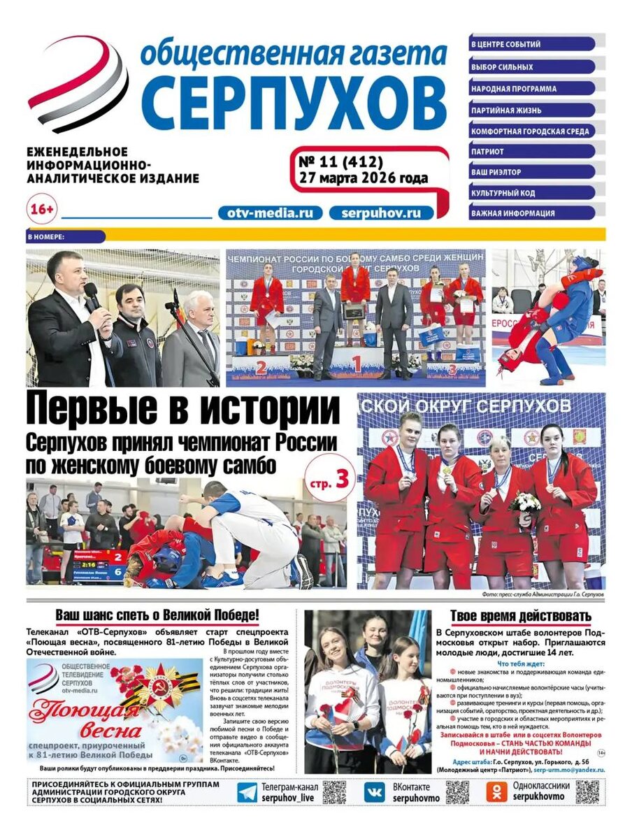 ✔️Главное — безопасность: Серпухов перевыполняет план по ямочному ремонту и готовится к «большой воде». Уровень Оки — под круглосуточным наблюдением. ✔️Старт в Серпухове. Репортаж с первого в истории спорта чемпионата России по женскому боевому самбо в ФОК «Русский медведь». ✔️25 марта — День работника культуры. Как народная программа «Единой России» меняет учреждения Большого Серпухова? Читайте в свежем номере! ✔️В Серпухове — активная фаза реконструкции старейших очистных сооружений Подмосковья. Главный плюс — экологическая безопасность округа. Следим за ходом работ. ✔️Ипотека без иллюзий: эксперт Светлана Бутрамеева — о том, как взять жилье на своих условиях и не попасть в ловушку, в рубрике «Ваш риелтор». ✔️Юные таланты из Пущино взяли награды на всероссийских конкурсах, активисты учились создавать цепляющий контент с экспертом, а в Серпухове школьники познакомились с работой Росгвардии — в новом выпуске рубрики «Патриот» от Молодежного медиацентра. Также в номере — полная пр