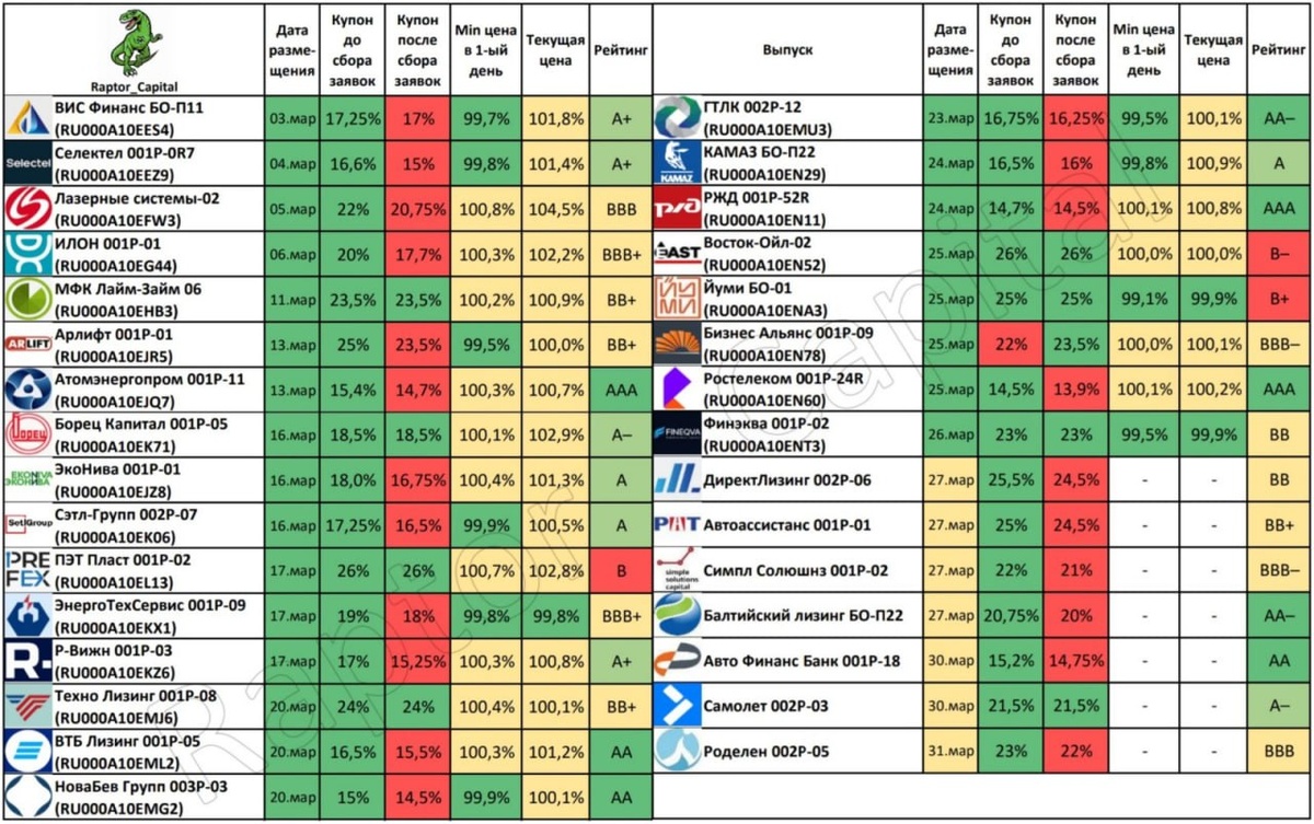 ? 👉Снижение купона В большинстве случаев при сборе заявок эмитенты снижают ставку купона или увеличивают объём размещения, иногда совмещают оба действия. Чем выше спрос на участие, тем сильнее компания может снизить купон, чтобы занять деньги на более выгодных условиях. Raptor Capital собрал в таблицу данные по всем выпускам облигаций с размещением в марте, нашёл 31 выпуск, 7 из которых ещё не разместились. Взял облигации только с фиксированным купоном, не брал СФО и облигации от банков. 👉Выводы по снижению купонов: ▪️В 22 из 31 выпусков эмитенты снижали ставку купона. Если не учитывать режим Z0, то купоны снизили в 22 случае из 25 (Z0 – прямое размещение, параметры выпуска определены заранее и не меняются, а заявки подаются и исполняются внутри одного дня). ▪️Среднее снижение купона составило –0,81%. При этом снижения на 1% или больше были в 11 случаях, ровно в половине из всех снижений. ▪️Больше всего снизили ставку купона в выпусках: на 2,3% в ИЛОН 001Р-01 ($RU000A10EG44); на