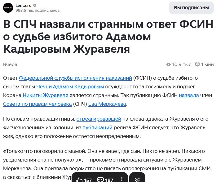 Уважаемые друзья! Последние дни русское общество немного гудит. Опять вспомнили о деле Никиты Журавеля. Думаю, что особо напоминать кому-либо о ситуации с Никитой не нужно?! Как пишут в СМИ, родители и друзья Никиты не имеют никакой возможности связаться со своим сыном и другом, который отбывает наказание, внимание!, в чечне, за сожжение корана, и кстати!, на территории немусульманского региона РФ - Волгоградской области.