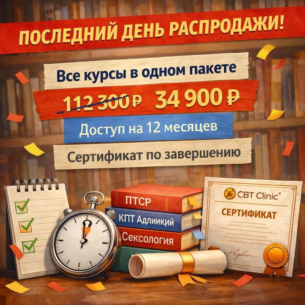 Обычно эти программы проходят отдельно и доступны только во время проведения обучения Сейчас они объединены в формат единой библиотеки: — терапия ПТСР и КПТСР — КПТ аддикций — КПТ перфекционизма — протокол работы с булимией и перееданием — сексология — CT-R 📚Формат библиотеки позволяет получить доступ сразу ко всем программам на 12 месяцев и возвращаться к материалам по мере необходимости в работе с клиентами Важно и то, что это полноценный образовательный формат: каждый курс завершается итоговым тестом 📝 🎓После прохождения теста выдается сертификат Обычно записи этих программ не находятся в открытом доступе и доступны только во время проведения обучения 📌 Сегодня последний день оформления доступа к библиотеке 👉 Посмотреть состав программ и выбрать пакет: https://cbtclinic.education/cbtclinicarchive