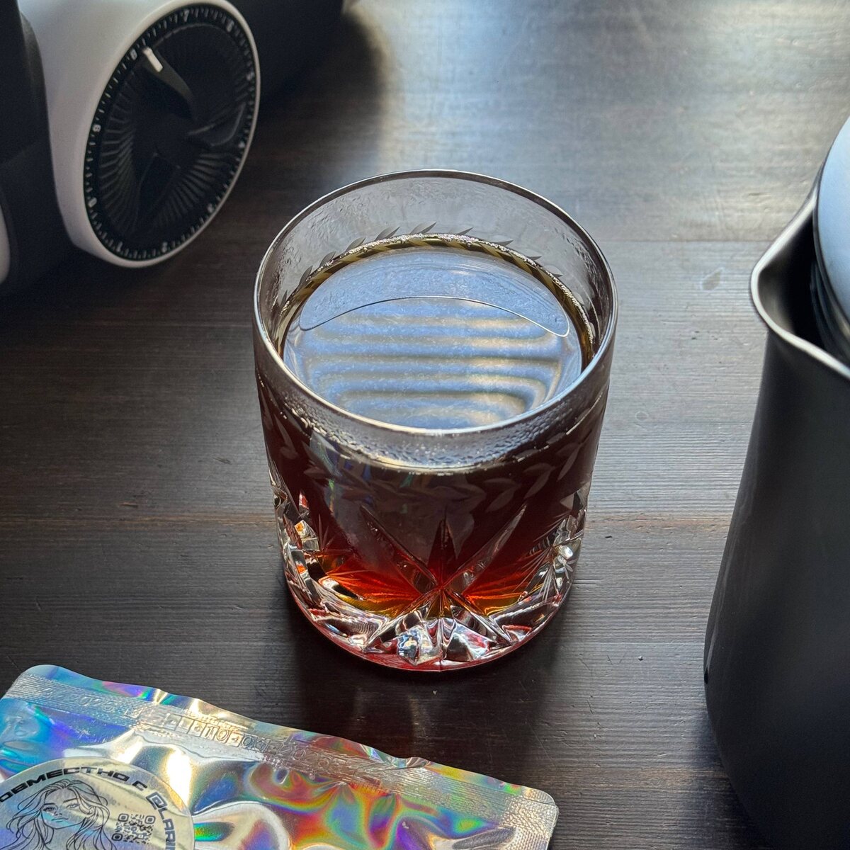 ☕️ Eternity Blend в обжарке под фильтр от обжарщика Mode Roasters В чашке у меня получился прикольный комплексный фильтр-кофе. В нём намешано множество вкусовых оттенков. Есть и ягодные, и конфетные, и легкие алкогольные. Они сменяют и дополняют друг друга во время каждого глотка, создавая ощущение калейдоскопа из вкусов. Эту ассоциацию дополнили переливающаяся разными цветами пачка и старый хрустальный стакан для виски Kristal Zajecar Montreal (Югославия). Этот бленд обжарщик Mode Roasters сделали вместе с кофейным блогером @larinajulia. Удачная коллаборация, получилось хорошо! Сетап: • кофеварка Fellow Aiden (профиль KOFEZAVR 1P30) • кофемолка Pietro с жерновами Pro Brewing / M Modal (помол на значении 7.8) #КофейныйБлокнот от @Кофезавра