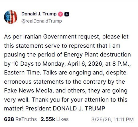 США до 6 апреля приостанавливают удары по энергообъектам Ирана, заявил Трамп