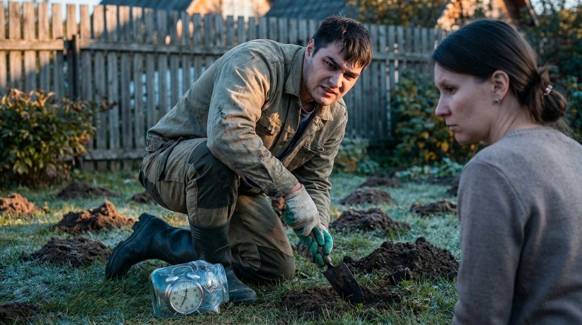 Взял стеклянную банку — литровую, с крышкой. Завёл будильник на максимум, чтобы трещал без остановки — там есть такая функция, непрерывный звон. Положил будильник в банку, банку закрыл, сверху ещё обмотал целлофановым пакетом и скотчем — чтобы земля внутрь не попала и влага не добралась. Лопатой сделал ямку примерно сантиметров тридцать глубиной прямо рядом с одним из свежих холмиков — значит, тоннель где-то рядом. Опустил банку, засыпал землёй, притоптал.