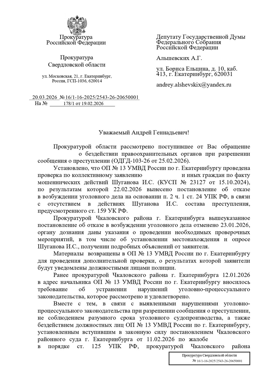 Масштаб кадрового голода огромен – четверть от штата. Но даже он не оправдывает правоохранителей, которые игнорируют проблемы сограждан. Земляки часто делятся со мной горькими историями о бездействии следователей, участковых. Неоднократно посвящал запросы ненадлежащей работе стражей порядка –добиваюсь ответов, разъяснений, действий. Как и в этот раз. Полтора года назад покупатели доверили свои кровно заработанные деньги предпринимателю, чтобы тот привез из‑за границы сотовые телефоны. С тех пор – ни товара, ни возврата средств. В поисках справедливости потерпевшие обратились в отдел полиции № 13 Екатеринбурга и столкнулись с отписками. Должностные лица лишь штамповали отказы в уголовном деле, не разбираясь в фактах. Не вмешайся прокуратура, райотдел давно бы «положил под сукно» жалобы на мошенничество.
