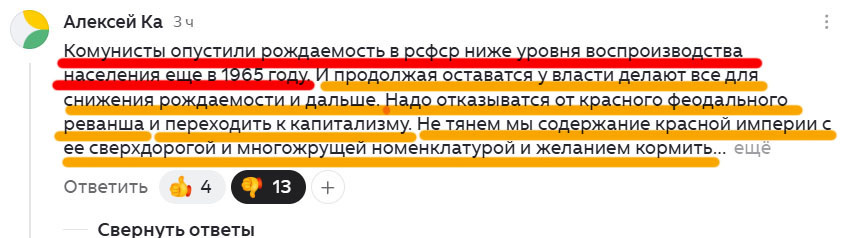 Продолжаю изумляться той дичи, которую несут антисоветчики, обвиняющие давно несуществующую советскую власть во всех мыслимых и немыслимых грехах и преступлениях. Вот очередной пример такого обвинения: Разберемся с выделенным красным обвинением в том, что коммунисты, якобы, опустили рождаемость ниже уровня воспроизводства еще в 1965 году. А вот бред, выделенный желтым цветом я вообще отказываюсь комментировать. Тут нужны психиатры. Для начала поспешу порадовать персонажа, что коммунисты умудрились снизить рождаемость(СКР) не только в России, но и во всех остальных промышленно развитых странах мира. Особенно досталось Германии, Японии, СКР которых тоже упал ниже 2 детей примерно в то же самое время, что и у нас: Получается, что и до них дотянулся проклятый Сталин! Так что, да, отрицать факт падения рождаемости в России я не буду. Сложно не снизить рождаемость, если делаешь из отсталой крестьянской страны промышленно развитую с большинством городского населения. Правда, советская власть