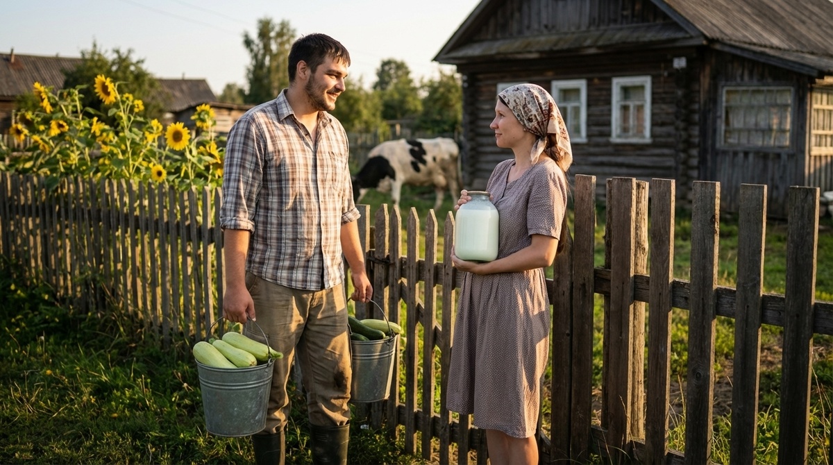 С бабой Нюрой с тех пор мы познакомились нормально. Оказалось, она и сама не против бартера — у неё молока много, а вот с огородом уже не справляется как раньше, здоровье не то. Теперь иногда меняемся: то кабачки, то огурцы, то зелень. Она нам молоко или сметану. По-человечески, без лишних разговоров.