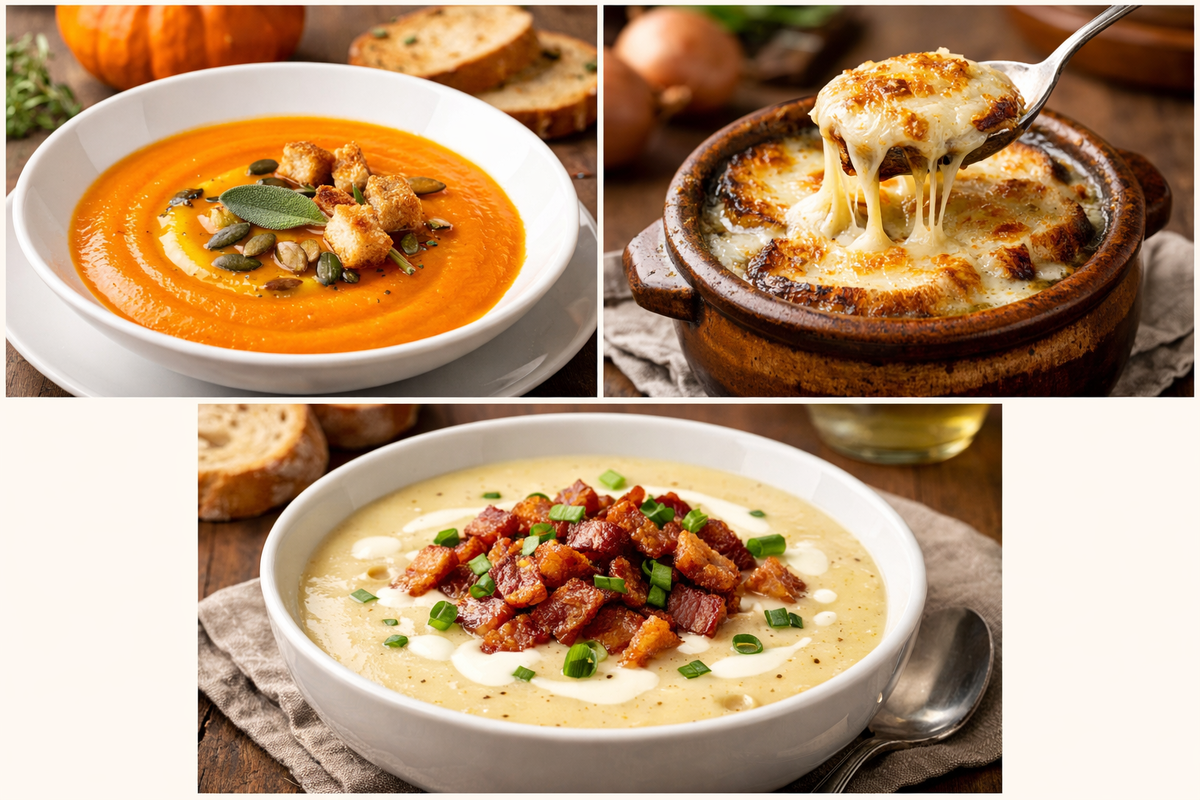 Сливочное наслаждение: итальянский суп-пюре из тыквы, французский луковый суп и немецкий картофельный суп-пюре с беконом