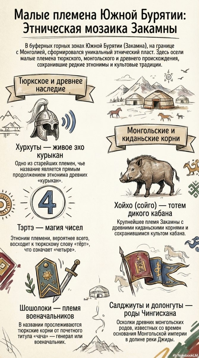 пласт. Здесь осели племена тюркского, монгольского и древнего происхождения, сохранившие редкие этнонимы и традиции. Ключевые группы региона: Хурхуты: живое наследие древних курыкан. Тэртэ: этноним, вероятно восходящий к тюркскому слову «четыре». Шошолоки: «племя военачальников», чье название связано с почетным титулом «генерал». Хойхо (сойго): племя с древними киданьскими корнями и тотемом дикого кабана. Салджиуты и долонгуты: осколки древних монгольских родов в долине реки Джиды. Канал нашей студии: https://t.me/chimitdorzhi_studio