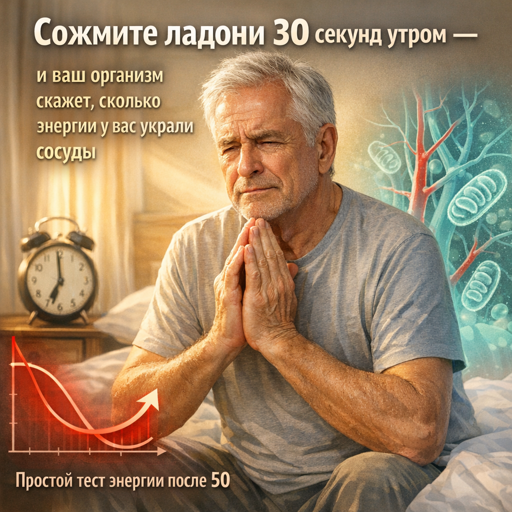 Просыпаетесь после 7–8 часов сна, а энергии — как будто и не было? Вроде спали нормально, давление более-менее, а уже к 11 утра хочется лечь обратно. Знакомо? Я сам это проходил. Было время у меня раньше когда каждое утро было пыткой. Потом я понял: даже при нормальном сне энергия может уходить из-за скрытой проблемы с сосудами и метаболизмом. Шокирующий факт По данным исследований 2025 года, у 68 % людей после 50 лет даже при нормальном давлении днём ночью и утром сосуды работают с перегрузкой. Из-за этого митохондрии (энергетические станции клеток) работают на 30–40 % слабее. Результат — хроническая усталость, хотя «анализы в норме». 5 скрытых признаков, что энергия уходит из-за сосудов и метаболизма Мини-тест: сколько энергии у вас реально остаётся? Ответьте «да» или «нет»: Сколько у вас «да»? 0–1 — энергия в норме 2–3 — уже есть скрытая проблема 4–5 — сосуды и метаболизм работают в режиме перегрузки 30-секундный утренний приём, который возвращает энергию (простой, безопасный, рабо
