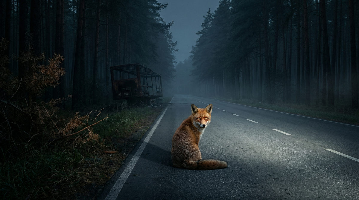 Дорога — это не просто полоска асфальта. Это пространство, которое умеет запоминать. В ночных рейсах, когда свет фар выхватывает лишь узкий кусок мира, реальность становится хрупкой. Ты перестаешь понимать: едешь ли ты вперед или мир за окном просто повторяет одну и ту же зацикленную сцену. Я ехал уже шестой час. В салоне пахло остывшим кофе. Радио выдавало лишь мерный, успокаивающий шум помех. Я люблю эту пустоту — в ней нет лишнего. Только ты, машина и зыбкий свет, скользящий по стволам придорожных сосен. Первый раз я увидел её возле обгоревшего остова старого прицепа на обочине. Рыжее пятно, неестественно изогнутое в свете фар. Сбитая лиса. Я не притормозил, лишь отвел взгляд. На трассе такое случается. Дорога всегда берет свою дань. Я взглянул на часы. Почти полночь. Дома ждали жена и сын. Мысль о тепле родного очага была моим единственным ориентиром в этой бесконечной черноте. Я чуть сильнее нажал на газ, желая быстрее проскочить этот унылый участок. Через десять минут я снова уви
