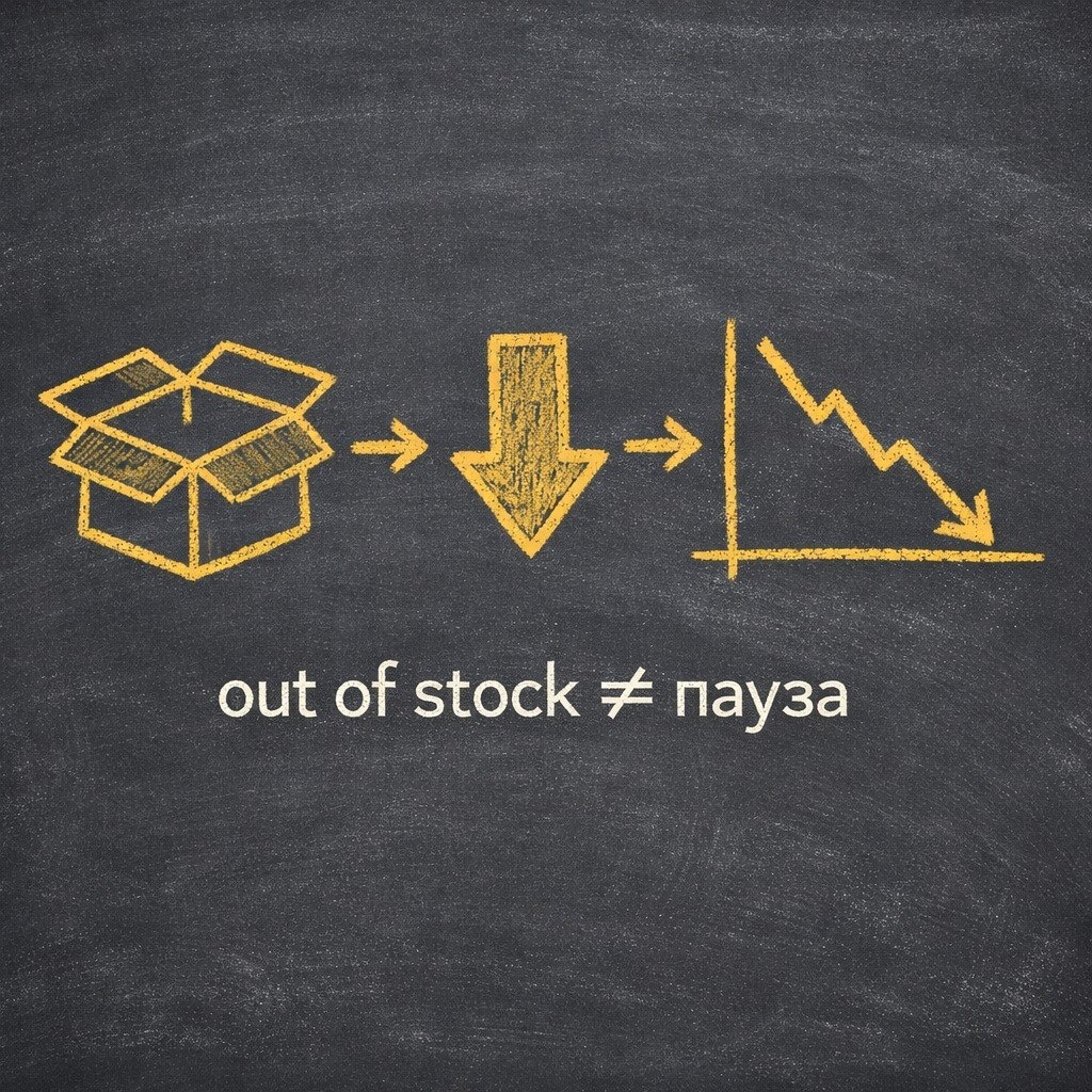 Полтора года на ВБ, нормальная прибыль, никаких проблем. И тут за две недели заказы просели в три раза. Начали копать. Оказалось, на одном товаре закончился сток, и он задрал цену — ну чтобы случайно не продать то, чего нет. Решение понятное. Только алгоритму ВБ оно не понравилось. Алгоритм видит просто: карточка висит, показы есть, а никто не покупает. Значит карточка плохая. И он её роняет. Причём вместе с ней начинает проседать весь магазин — это многие не понимают, но ВБ оценивает продавца целиком, а не по отдельным товарам. Ладно, товар вернулся, цена нормальная. Но заказы не вернулись. Ты уже в яме, и сам по себе оттуда не вылезешь. Запускаем рекламу, разными инструментами разгоняем конверсии. Суть одна — надо показать алгоритму, что карточка снова живая. Что люди покупают. Тогда позиции начнут возвращаться. Медленно, но начнут. Аут-оф-сток на маркетплейсе — это не пауза. Это откат назад. И возвращение стоит денег, которые ты мог не тратить. Если чувствуешь, что товар заканчи