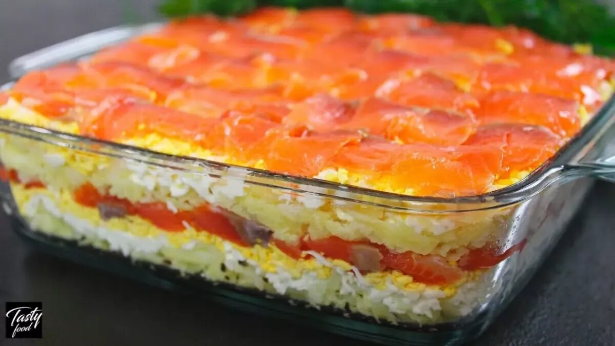 Начните с нарезки красной рыбы на средние кубики и выложите ее первым слоем на плоское блюдо. Сверху нанесите сетку из майонеза.