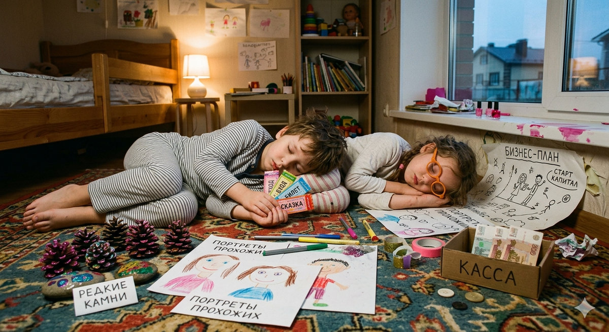 - Мам, нам нужен стартовый капитал и бизнес-план, - серьезно заявил Мишка, отрываясь от рисования на куске обоев. Машка рядом согласно закивала, поправляя на носу воображаемые очки.