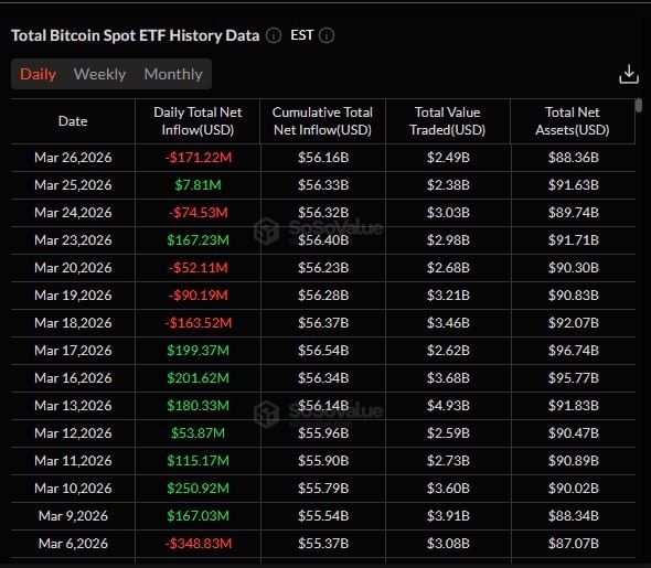 πΈ26 ΠΌΠ°ΡΡΠ° ΡΠΏΠΎΡΠΎΠ²ΡΠ΅ Π±ΠΈΡΠΊΠΎΠΈΠ½-ETF Π·Π°ΡΠΈΠΊΡΠΈΡΠΎΠ²Π°Π»ΠΈ ΠΎΠ±ΡΠΈΠΉ ΡΠΈΡΡΡΠΉ ΠΎΡΡΠΎΠΊ ΡΡΠ΅Π΄ΡΡΠ² Π² ΡΠ°Π·ΠΌΠ΅ΡΠ΅ $171 ΠΌΠ»Π½, Π° ΡΠΈΡΡΡΠΉ ΠΎΡΡΠΎΠΊ ΡΡΠ΅Π΄ΡΡΠ² ΠΈΠ· ΡΡΠΈΡΠΈΡΠΌ-ETF ΡΠΎΡΡΠ°Π²ΠΈΠ»