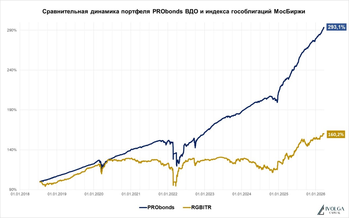 Результаты и кондиции. Доходность к погашению портфеля PRObonds ВДО падает. На конец года она составляла 24,1%, а сейчас уже 22%. Год назад было, вообще, более 30%. Теперь удержать даже 20% за 2026 год – задачка. Пока в нынешнем году идем с накопленной доходностью чуть выше 21%. При этом за последние 12 месяцев результат всё еще неплох, 27,4%. Выше большинства альтернатив вложений. Сводный кредитный рейтинг портфеля немного просел, был на уровне «A», теперь «A-». Входящие в портфель облигации имеют средний рейтинг «BBB», верхняя ступень для ВДО (по оценке Иволги). Считаем, что внезапные дефолтные риски на этих уровнях малы. Дюрация чуть длиннее, чем была последние месяцы, но всё равно очень короткая, 0,8 года. С ней портфель не склонен к раскачиваниям и просадкам. А предсказуемость в получении дохода – один из смыслов управления. Операции. Тут появилось новшество, которое проявит себя в самом ближайшем будущем. Иволга начала участвовать в размещениях других организаторов или в со-орган