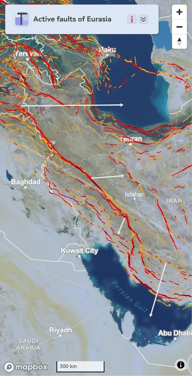 Ночью в отделившемся хвосте циклона вдоль границы Ирана-Ирака наблюдался ОСТИ, максимальная протяжённость которого дотягивала до потенциального значения М7.3+/-0.2. В течение 9 дней есть вероятность сильного землетрясения по данной зоне (северо-восточная граница Аравийской плиты). ===== At night, a CSTI was observed in the separated tail of the cyclone along the Iran-Iraq border, the maximum length of which reached the potential value of M7.3+/-0.2. Within 9 days, there is a possibility of a strong earthquake in this zone (the northeastern boundary of the Arabian Plate).