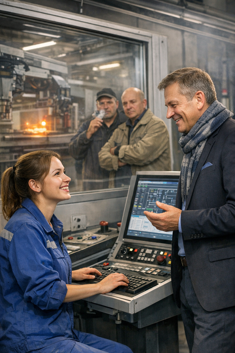 Марина кивнула и с готовностью повернулась к пульту. Движения стали спокойными, выверенными, без суеты. Она сбросила ошибку, перегрузила программу, запустила процесс заново. Ее пальцы бегали по клавишам с уверенностью, которой никто в этом цехе от нее раньше не видел.