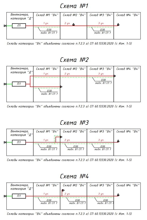 На форуме ОВиК project возникла дискуссия по поводу транзитных воздуховодов. Оказалось, что нет единого мнения, что считать транзитным воздуховодом и соответственно какие участки воздуховодов покрывать огнезащитой. Поэтому подготовил различные схемы общеобменной вентиляции, которые отображали бы все возможные подходы проектировщиков к определению транзитного воздуховода и его огнезащиты, и направил запрос в ФГБУ ВНИИПО МЧС России. К сожалению, ответ ФГБУ ВНИИПО МЧС России не такой развернутый, как хотелось бы. Но есть ответ на второй вопрос, который будет очень полезен. Текст обращения в ФГБУ ВНИИПО МЧС России: "Согласно п.2.17.6 ГОСТ 22270-2018 транзитный воздуховод (transit duct): участок воздуховода, прокладываемый за пределами обслуживаемого помещения или группы помещений. У проектировщиков сложилось два противоположных подхода к определению транзитного воздуховода. Подход №1 представлен на схеме №1. Система вентиляции обслуживает склады №2 и №4. В помещении склада №2 установлен во