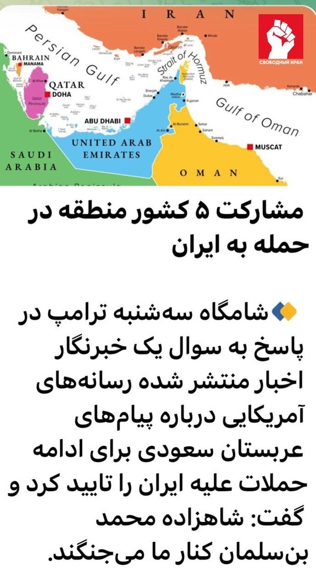 ⚡️ По данным Fars и Tasnim со ссылкой на иранские спецслужбы, Бахрейн, Катар, Кувейт, ОАЭ и Саудовская Аравия предоставили США территорию, небо, воду и инфраструктуру для атак по Ирану. Ранее Трамп говорил, что Мухаммед бин Салман сражается на нашей стороне, а посол ОАЭ в США отдельно поддержал американско-израильские удары. Подпишитесь на канал