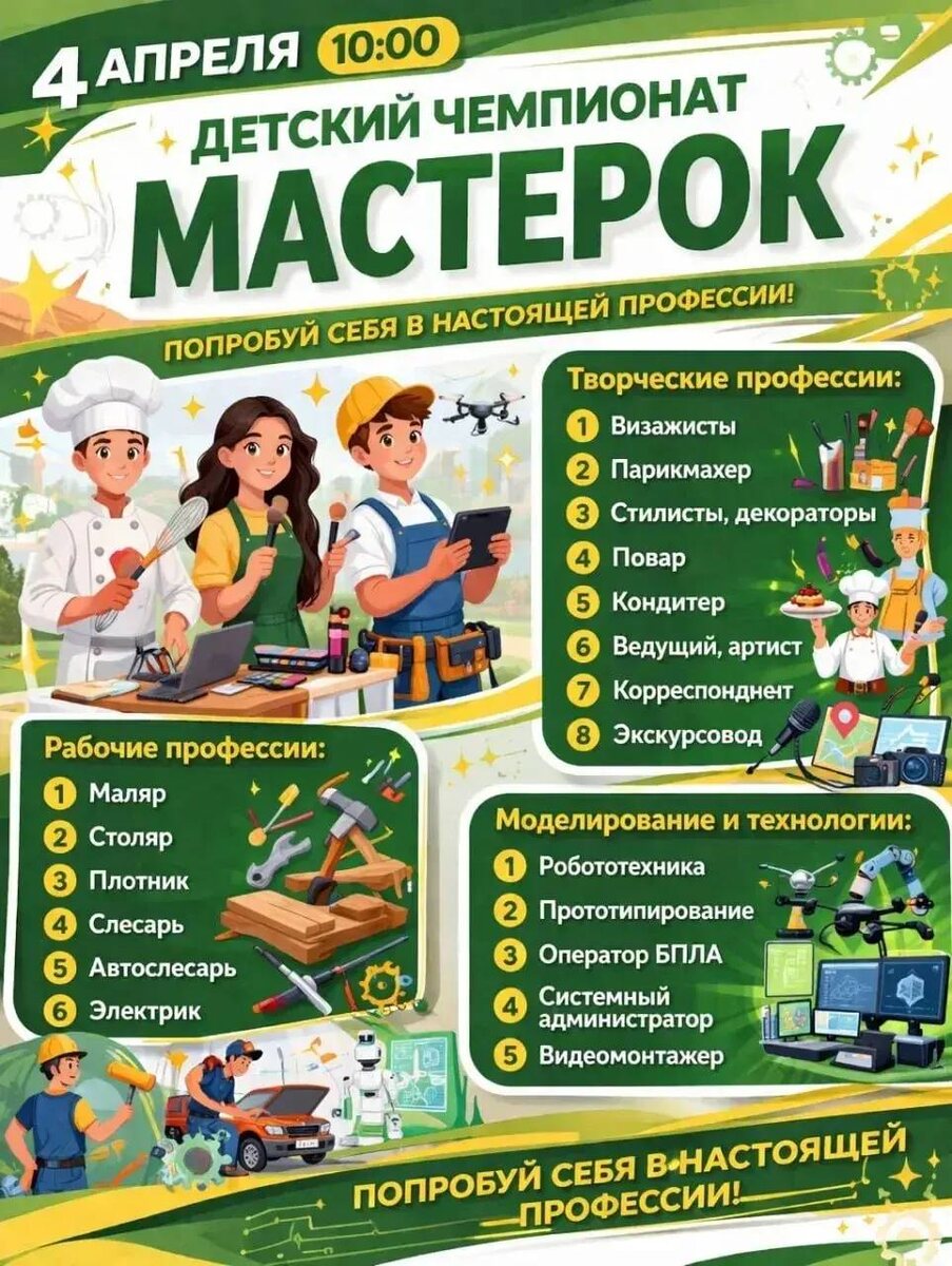 » Совсем скоро в нашем округе пройдет чемпионат ранней профориентации «Мастерок». Это уникальная возможность для детей разных возрастов попробовать себя в различных профессиях и раскрыть свои таланты. – «Мастерок» – это не просто соревнования, это увлекательное погружение в мир профессий, где каждый ребенок сможет почувствовать себя настоящим мастером своего дела, – говорит директор школы № 29, которая является организатором события, Анна Киселева. Организаторы обещают интересные конкурсы, мастер-классы и возможность получить ценные навыки. Приглашаются к участию все желающие дети! А взрослых организаторы призывают стать надежной группой поддержки для юных профессионалов и вдохновить их на новые свершения. Регистрация: https://forms.gle/gLh1bLWegG1xFojL6 Читай новости Берёзовского в ВК | МАХ