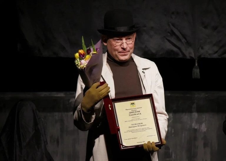 В Оренбурге торжественно вручили ежегодную муниципальную премию «Кумир». Ее обладателем стал актер-кукловод театра «Пьеро» Дмитрий Толкунов. Дмитрий Толкунов служит в театре кукол «Пьеро» с 1996 года. Он выступает как в детских спектаклях, так и в постановках для взрослой аудитории. В прошлом году он сыграл 160 спектаклей. В этом сезоне он участвует в 24 постановках. Актер является лауреатом многочисленных конкурсов и участником международных фестивалей. Премию «Кумир» вручают с 1999 года актерам, режиссерам, театральным художникам, театральным критикам, деятелям театров, проработавшим в городе не менее 20 лет за значительный вклад в развитие театральной жизни Оренбурга. После торжественной церемонии гости посмотрели спектакль «Что будет после», главную роль в котором исполнил обладатель премии «Кумир» Дмитрий Толкунов. Фото: пресс-служба администрации Оренбурга