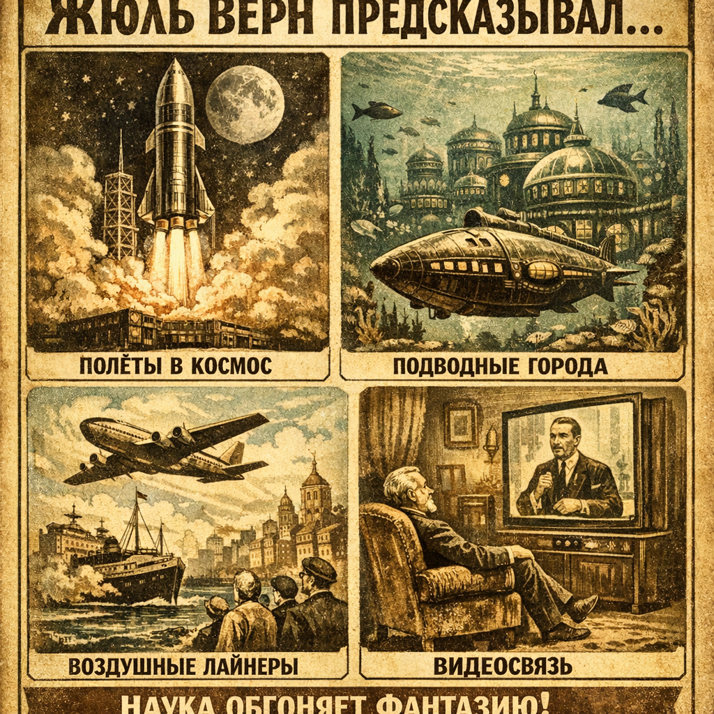 Жюль Верн — один из самых ярких провидцев в истории литературы. Его романы, написанные в эпоху паровых машин и телеграфа, предвосхитили многие достижения XX и XXI веков. В 1865 году вышел роман "С Земли на Луну" ("De la Terre à la Lune"), где Верн описал полёт человека на Луну с поразительной точностью. Но это лишь вершина айсберга. Давайте разберёмся, что именно предсказал писатель, и узнаем другие забавные и удивительные факты о его жизни и работах.