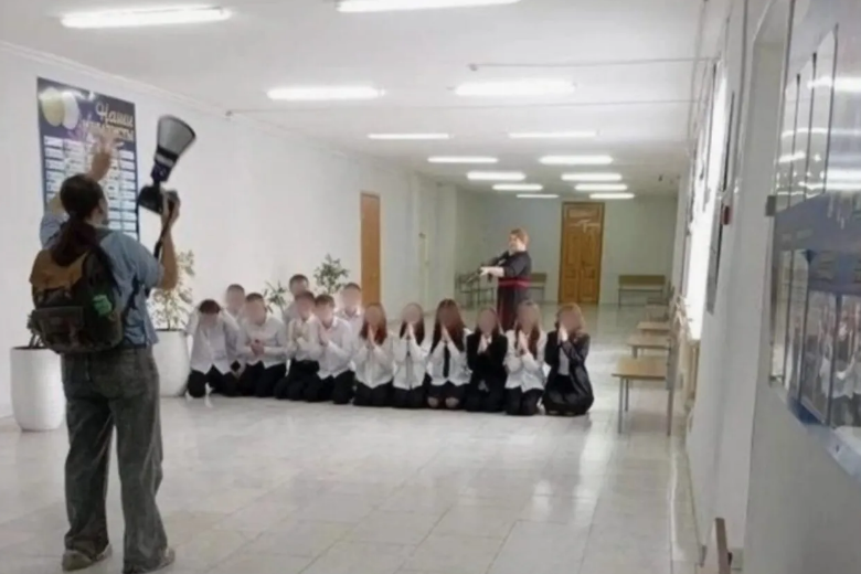 На одном из фото детей выстроили в коридоре, поставив на колени, а учительница навела на них автомат, в роли которого выступил реквизит из класса ОБЖ.