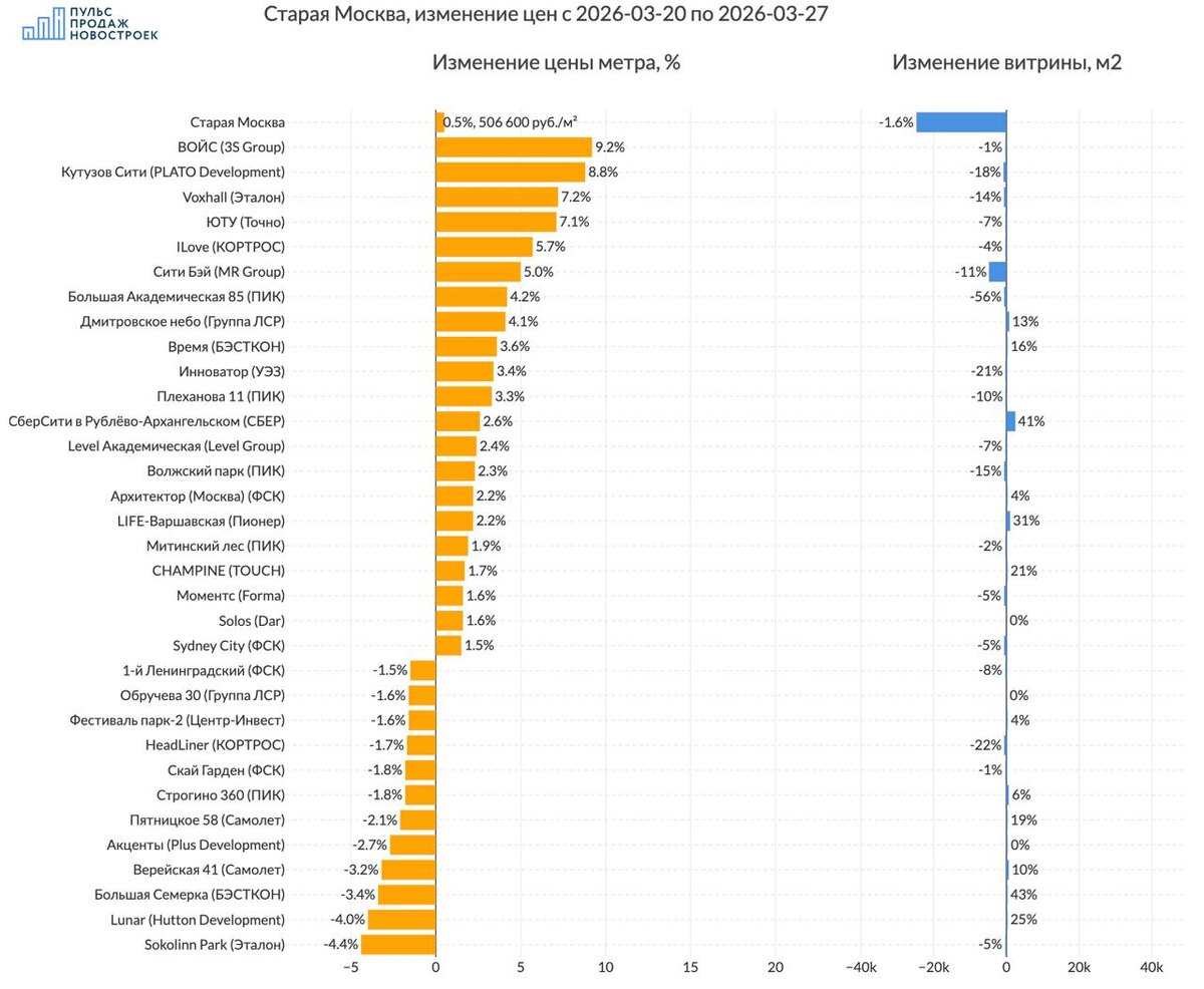 💰 Смотрим без премиум и элит классов. 💵 За 7 дней цена метра выросла на 0.5% до 506 600 рублей за метр. 📈Топ изменения цен (подорожало): 1️⃣ЖК "ВОЙС" (3S Group) цена метра +9.2%, витрина предложения уменьшилась на 126м2 2️⃣ЖК "Кутузов Сити" (PLATO Development) цена метра +8.8%, витрина предложения уменьшилась на 810м2 3️⃣ЖК "Voxhall" (Эталон) цена метра +7.2%, витрина предложения уменьшилась на 674м2 🪫Анти топ (подешевело): 1️⃣ЖК "Sokolinn Park" (Эталон) -4.4% в цене, витрина предложения уменьшилась на 89м2 2️⃣ЖК "Lunar" (Hutton Development) -4.0% в цене, объем витрины при этом увеличился на 214м2 3️⃣ЖК "Большая Семерка" (БЭСТКОН) -3.4% в цене, объем витрины при этом увеличился на 152м2 ☄️Объем предложения жилья в регионе ниже -1.6% (-24774 м2) Все изменения в регионе на картинке. ‼️Только для наших подписчиков в телеграмм два сайта - сервис истории цен для поиска выгодных предложений и аналитики по проектам ПИК - рейтинг продаж ЖК с историей 🔥 @pulsprodaj
