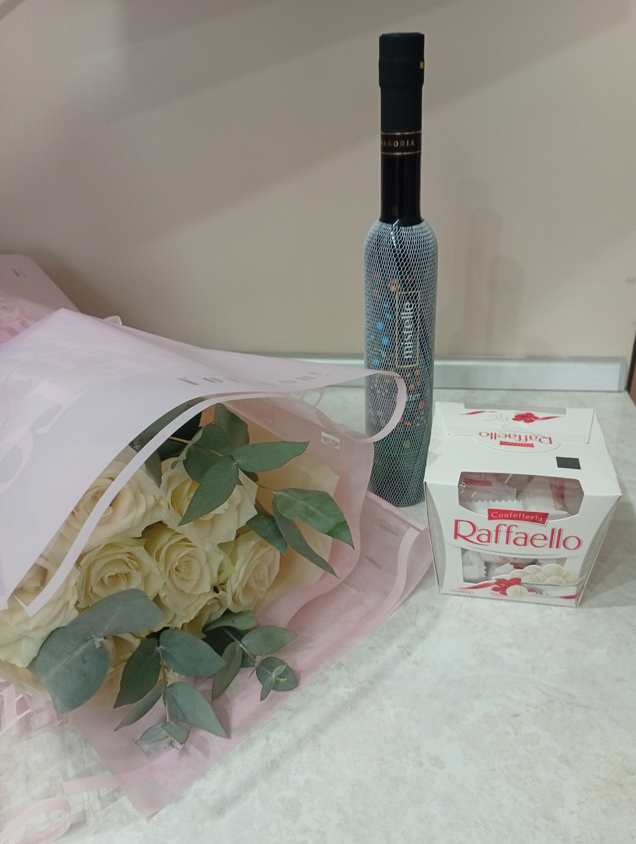 Муж сбегал за цветами. Купил букет из девяти белых роз, Рафаэлло и бальзам.