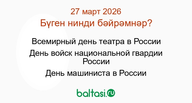 • Всемирный день театра в России Ежегодно 27 марта все работники театров и поклонники театрального искусства в России, как и во многих других странах, отмечают Всемирный день театра (англ. Worl... • День войск национальной гвардии России 27 марта свой профессиональный праздник — День войск национальной гвардии Российской Федерации — отмечают военнослужащие и гражданский персонал войск национальн... • День машиниста в России В последнюю пятницу марта в системе российских железных дорог отмечается новый корпоративный праздник – День машиниста , установленный в 2023 году распоряжением... Подписаться: 📌 VK: vk.com/baltasi 📌 Max: max.ru/baltasi