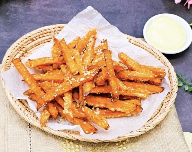 Это отличная идея для перекуса или легкого ужина. Хрустящие картофельные палочки отлично контрастируют с нежным, слегка ореховым хумусом и свежей ноткой сельдерея.
