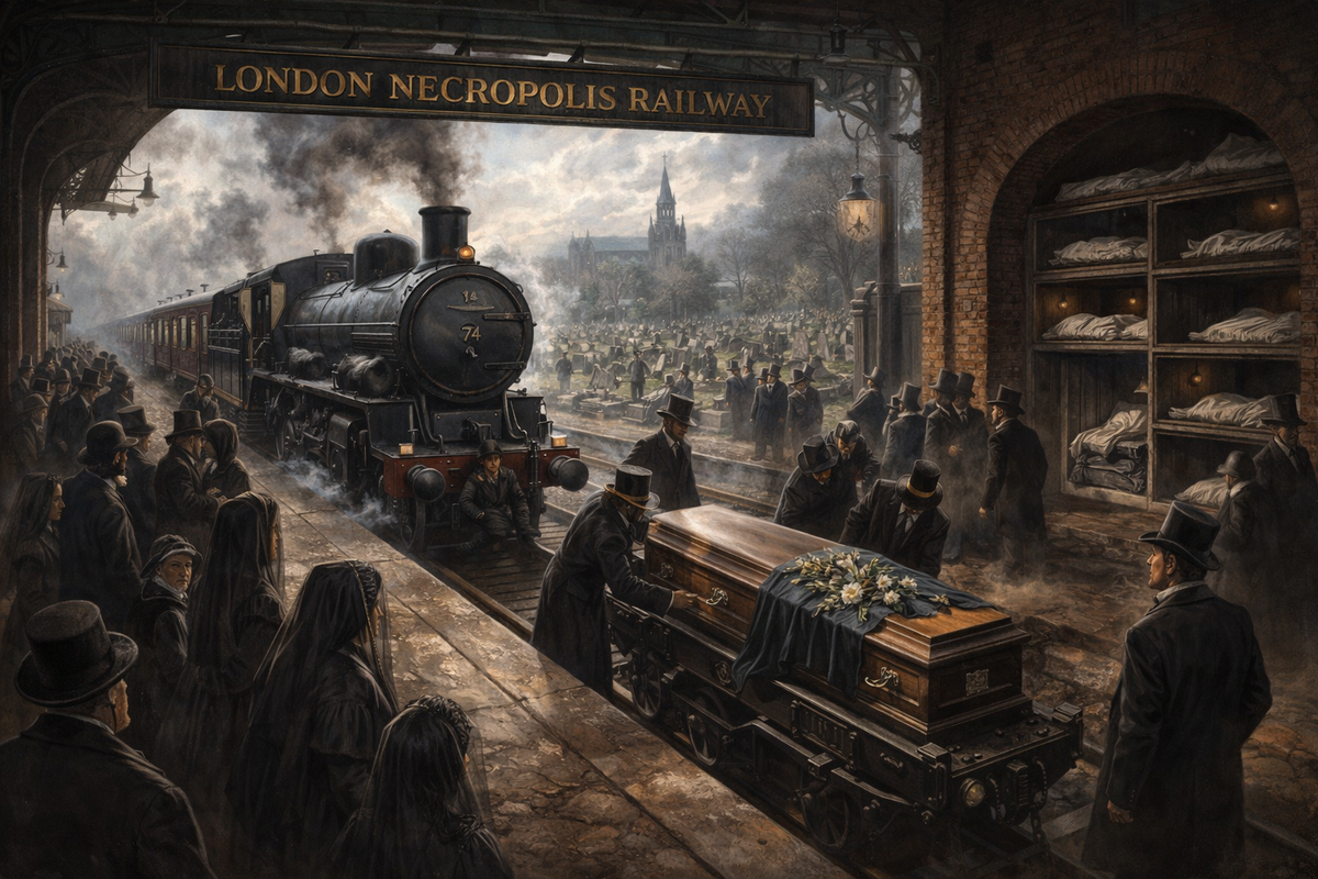 На протяжении 87 лет из Лондон ежедневно отправлялся поезд, который не имел аналогов в мире. Он выезжал со станции Ватерлоо, совершал короткое путешествие и в тот же день возвращался обратно. Дорога занимала около сорока минут. За это время за окнами проплывали идиллические пейзажи: Вестминстер, зелёные просторы Ричмонд-Парк, величественный Хэмптон Корт. Маршрут был красивым. Почти нарочито красивым. И это выглядело странно, потому что большинство пассажиров этого поезда уже ничего не видели. Это был поезд мертвецов. Город, в котором закончилась земля К середине XIX века Лондон столкнулся с проблемой, о которой предпочитали не говорить вслух. Город умирал - не метафорически, а буквально задыхался от собственных кладбищ. Каждый год хоронили около 50 000 человек. Захоронения располагались прямо в городе, вокруг церквей, во дворах, иногда буквально под окнами жилых домов. Земли катастрофически не хватало. Старые могилы вскрывались, останки перемещались, санитарная ситуация становилась вс