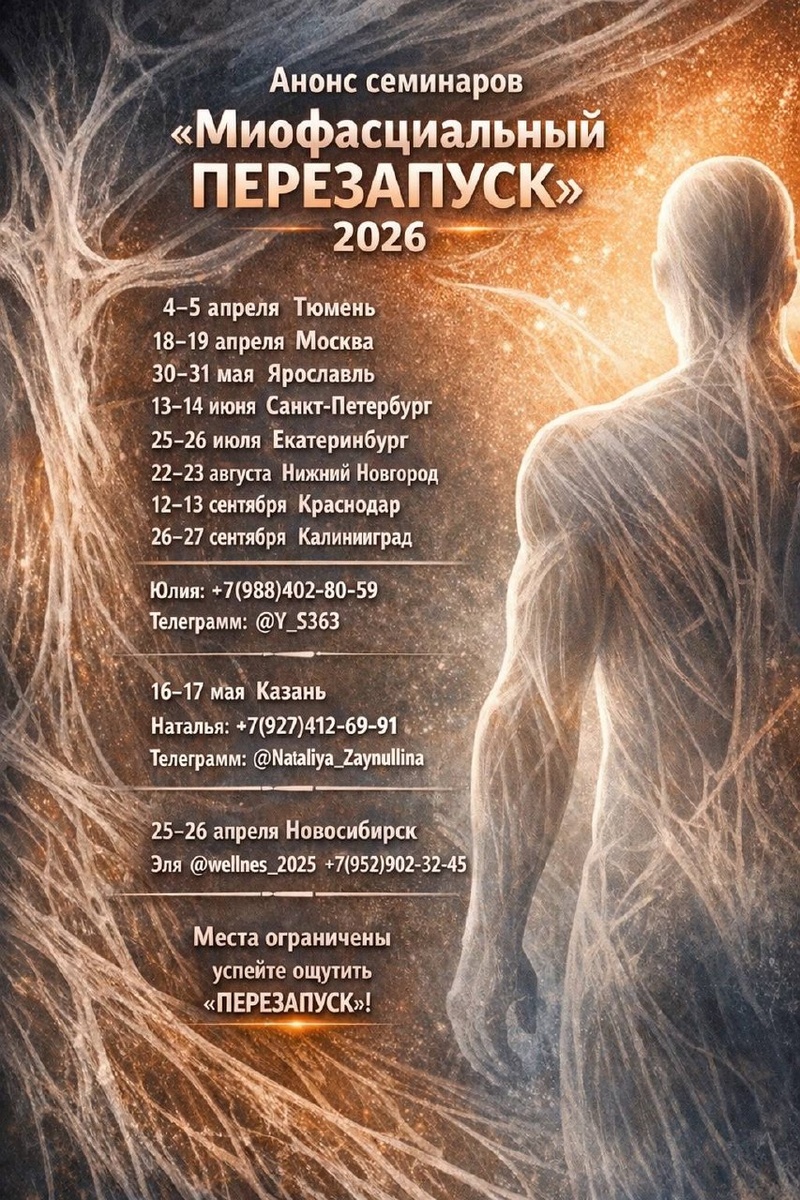 «Миофасциальный перезапуск» Приглашаем специалистов на авторский семинар, который меняет взгляд на тело, движение и восстановление. Это не просто обучение — это новый уровень чувствительности рук, понимания фасции и работы с постуральными нарушениями. 📍География 2026: 4–5 апреля — Тюмень 18–19 апреля — Москва 25–26 апреля — Новосибирск 16–17 мая — Казань 30–31 мая — Ярославль 13–14 июня — Санкт-Петербург 25–26 июля — Екатеринбург 22–23 августа — Нижний Новгород 12–13 сентября — Краснодар 26–27 сентября — Калининград Запись и вопросы: Юлия +7 (988) 402-80-59 Telegram: @Y_S363 📍Казань: Наталья +7 (927) 412-69-91 Telegram: @Nataliya_Zaynullina 📍Новосибирск: Эля @wellnes_2025 +7 (952) 902-32-45 ⚡️Что вы получите: — Чёткое понимание фасциальных цепей — Практические техники с быстрым результатом — Навык «видеть и чувствовать» тело глубже — Работа с постуральным стрессом и компенсациями — Профессиональное окружение и рост 🔴Места ограничены Успейте ощутить свой «перезапуск» #Миоф