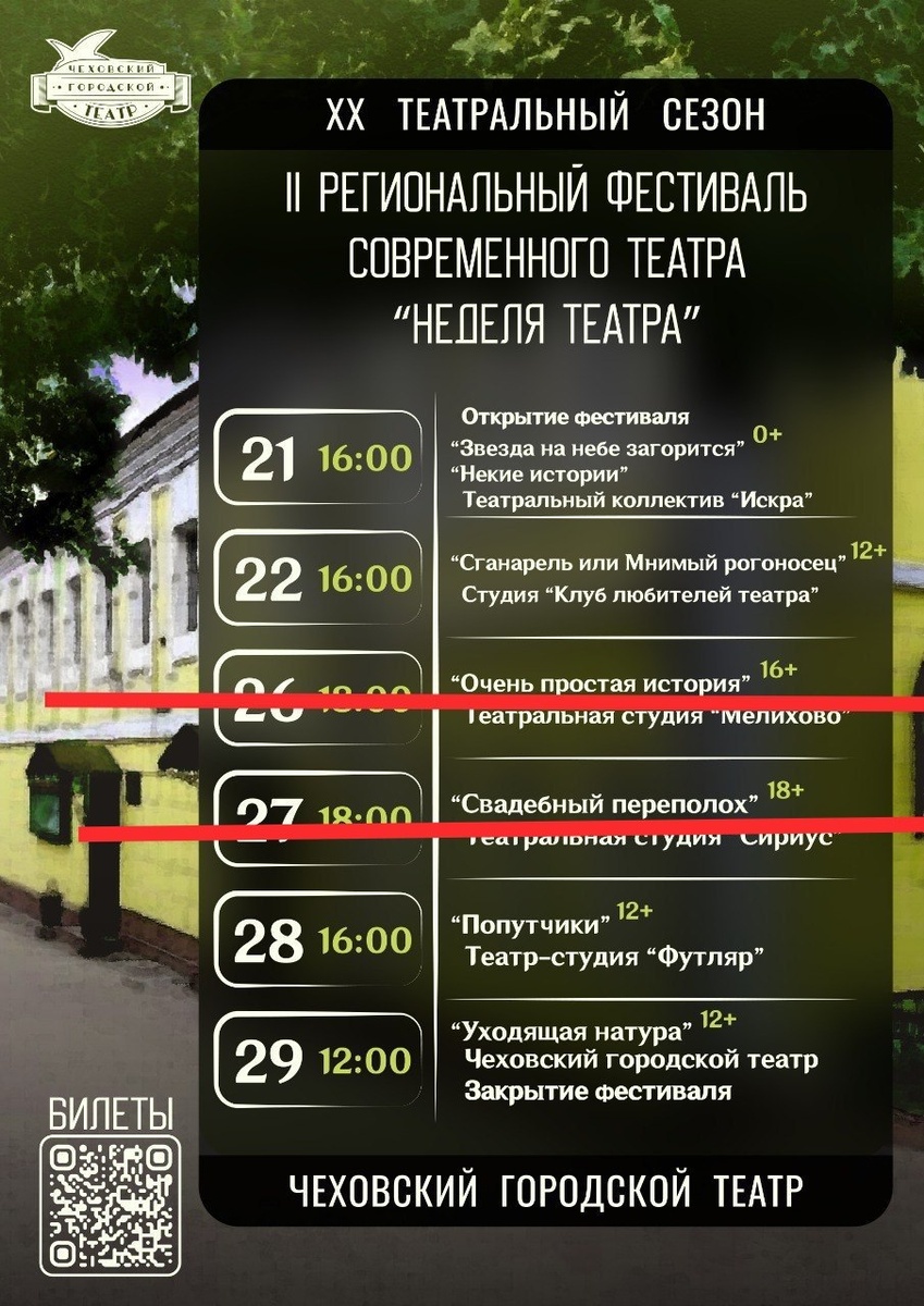 ✨ Изменения в театральной неделе в Городском театре Анонс ранее 👉https://dzen.ru/media/chekhov_events/-festival-sovremennogo-teatra-nedelia-teatra-69b9499906d50a260cd216e0 👉https://vk.ru/wall-217868869_14814 ❗Внимание❗ К сожалению по техническим причинам 27 марта спектакль "Свадебный переполох" НЕ состоится Все купленные билеты можно вернуть или использовать для посещения других спектаклей фестиваля 📆 27.03.2026 🏢 «ЧЕХОВСКИЙ ГОРОДСКОЙ ТЕАТР» 📍 г. Чехов, ул. Московская, д.40 ⭐Поддержать канал голосом ✅ Мероприятия Чехов https://dzen.ru/id/66cc4b48e9ef144699238a51 https://vk.ru/chekhov_events http://dzen.ru/chekhov_events