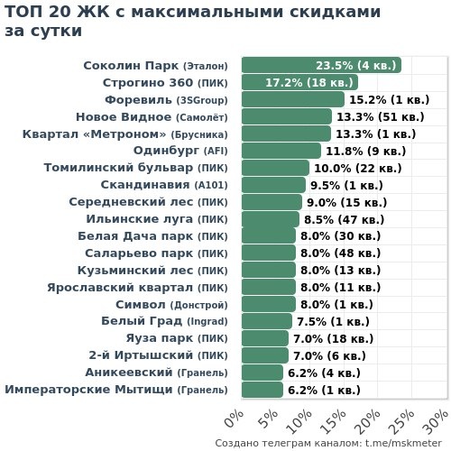 🟩 Честные скидки: 39 ЖК (348 кв.) 🟧 Маркетинг скидки: 19 ЖК (183 кв.) 💎 МАКСИМАЛЬНАЯ ЭКОНОМИЯ 🏆 Эталон • Соколин Парк ├🔻7.2M → 31.2M • 3-к 79м² ├🔻3.9M → 16.5M • 1-к 39м² └🔻3.8M → 17.7M • 1-к 42м² 🥈 ПИК • Строгино 360 ├🔻5.8M → 36.1M • 3-к 81м² ├🔻4.7M → 27.2M • 3-к 74м² └🔻3.8M → 24.3M • 2-к 53м² 🥉 Брусника • Квартал «Метроном» └🔻3.5M → 26.8M • 1-к 104м² 4️⃣ Sminex • Foriver ├🔻3.1M → 90.6M • 3-к 162м² └🔻2.8M → 82.8M • 3-к 144м² 🔑 САМЫЕ ДОСТУПНЫЕ 🏆 Гранель • Пехра └🔻303к → 4.9M • Студия 27м² 🥈 Гранель • Аникеевский ├🔻319к → 5.2M • Студия 27м²❗️ └🔻391к → 6.3M • Студия 27м² 🥉 Самолёт • Космический Квартал └🔻156к → 5.2M • Студия 26м² 4️⃣ Самолёт • Новое Видное ├🔻132к → 5.4M • Студия 22м² ├🔻139к → 5.7M • Студия 26м² └🔻136к → 5.7M • 1-к 35м² 5️⃣ ПИК • Ильинские луга └🔻509к → 6.4M • Студия 20м² 6️⃣ 1 ДСК • 1-й Донской └🔻97к → 6.4M • Студия 27м² ❗️— лоту меньше месяца 👇 Полная статистика: 📲 В Telegram | 🌐 На MskMeter.ru