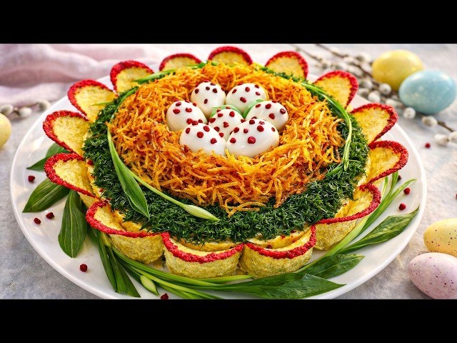 - Поверх «гнезда» поместите отварные перепелиные яйца.