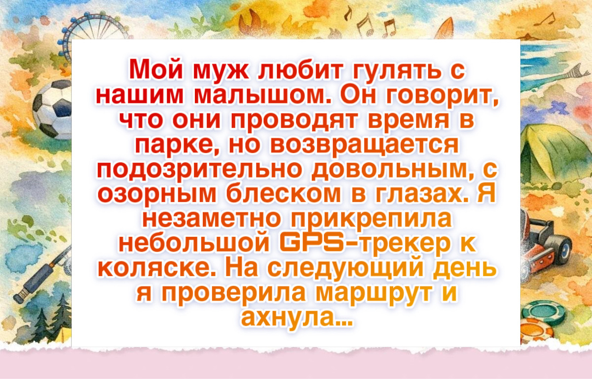 “Мой муж очень любит гулять с нашим ребенком. Говорит, что они гуляют в парке, но возвращается он подозрительно довольный. Я незаметно прикрепила маленький GPS-трекер к коляске.
