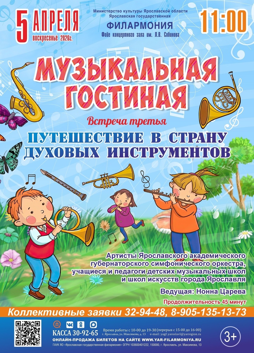! ✨ 📆05.04.2026г. состоится третья встреча, в рамках цикла "Музыкальная гостиная" в фойе 2 этажа - "Путешествие в страну духовых инструментов" Перед ребятами выступят артисты Ярославского академического губернаторского симфонического оркестра, а также учащиеся и педагоги ДМШ и ДШИ г. Ярославля. 🎶🎼В программе: завораживающие произведения от классики до джаза: П. И. Чайковский, «Колыбельная», И. С. Бах, «Шутка», «Мелодия» из оперы «Орфей», джазовый хит Take Five и другие. Вы услышите виртуозное исполнение на разнообразных духовых инструментах: кларнете, фаготе, гобое,трубе и флейте, а проводником в путешествии по увлекательному миру духовых инструментов станет ведущая - Нонна Царева. Она откроет ребятам тайны происхождения и звучания этих удивительных инструментов. 🎷🎺📯 💫Не упустите шанс подарить себе и своим детям незабываемый музыкальный опыт!💫 Билеты: quicktickets.ru/yaroslavl-... #ЯрославскаяФилармонияДетям #культура76 #Филармониядетям #культурадляшкольниковяо #куль Показ