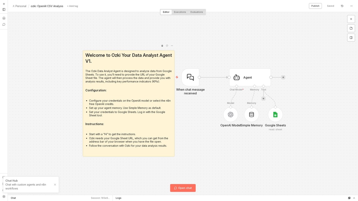 ⚡ Что делает: Автоматизация загружает CSV-файл из Google Sheets, анализирует данные с помощью OpenAI, создаёт резюме и выводит результаты в виде заметки. Запускается по триггеру чата, обеспечивая интерактивный анализ. 👥 Кому подойдёт: Подходит аналитикам и маркетологам, желающим быстро обрабатывать данные. 💡 Пример: Анализируя таблицу с продажами, автоматизация формирует краткий отчет о лучших продуктах и отправляет его в мессенджер. 🔗 Ноды: Chat Trigger, Google Sheets Tool, Lm Chat Open Ai, Memory Buffer Window, Agent 📊 Сложность: Средний #n8n #automation #nocode #aiagent #ai #chattrigger ════════════════ 🎬 YouTube | ⚙️ Канал | 💬 Чат | 📮 Реклама