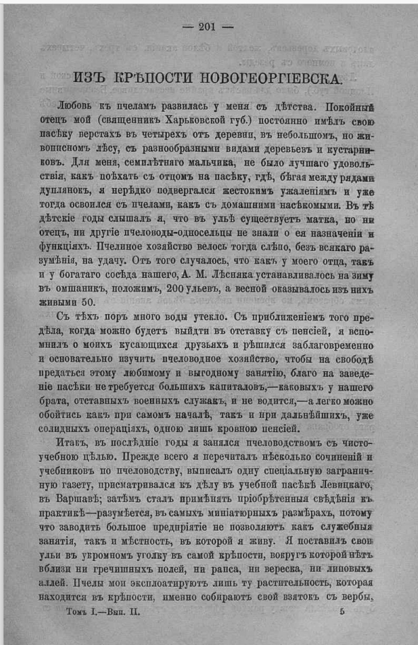 Любовь к пчёлам развилась y меня с детства. Покойный отец мой (священник Харьковской губернии) постоянно имел свою пасеку вёрстах в четырёх от деревни, в небольшом, но живописном лесу с разнообразными видами деревьев и кустарников. Для меня, семилетнего мальчика, не было лучшего удовольствия, как поехать с отцом на пасеку, где, бегая между рядами дуплянок, я нередко подвергался жестоким ужалениям и уже тогда освоился с пчёлами, как с домашними насекомыми. В те детские годы слышал я, что в улье существует матка, но не отец, ни другие пчеловоды-односельцы не знали о её назначении и функциях. Пчелиное хозяйство велось тогда слепо, без всякого разумения, на удачу. От того случалось, что как y моего отца, так и y богатого соседа нашего, A. М. Лесняка устанавливалось на зиму в омшаник, положим, 200 ульев, a весной оказывалось из них живыми 50.