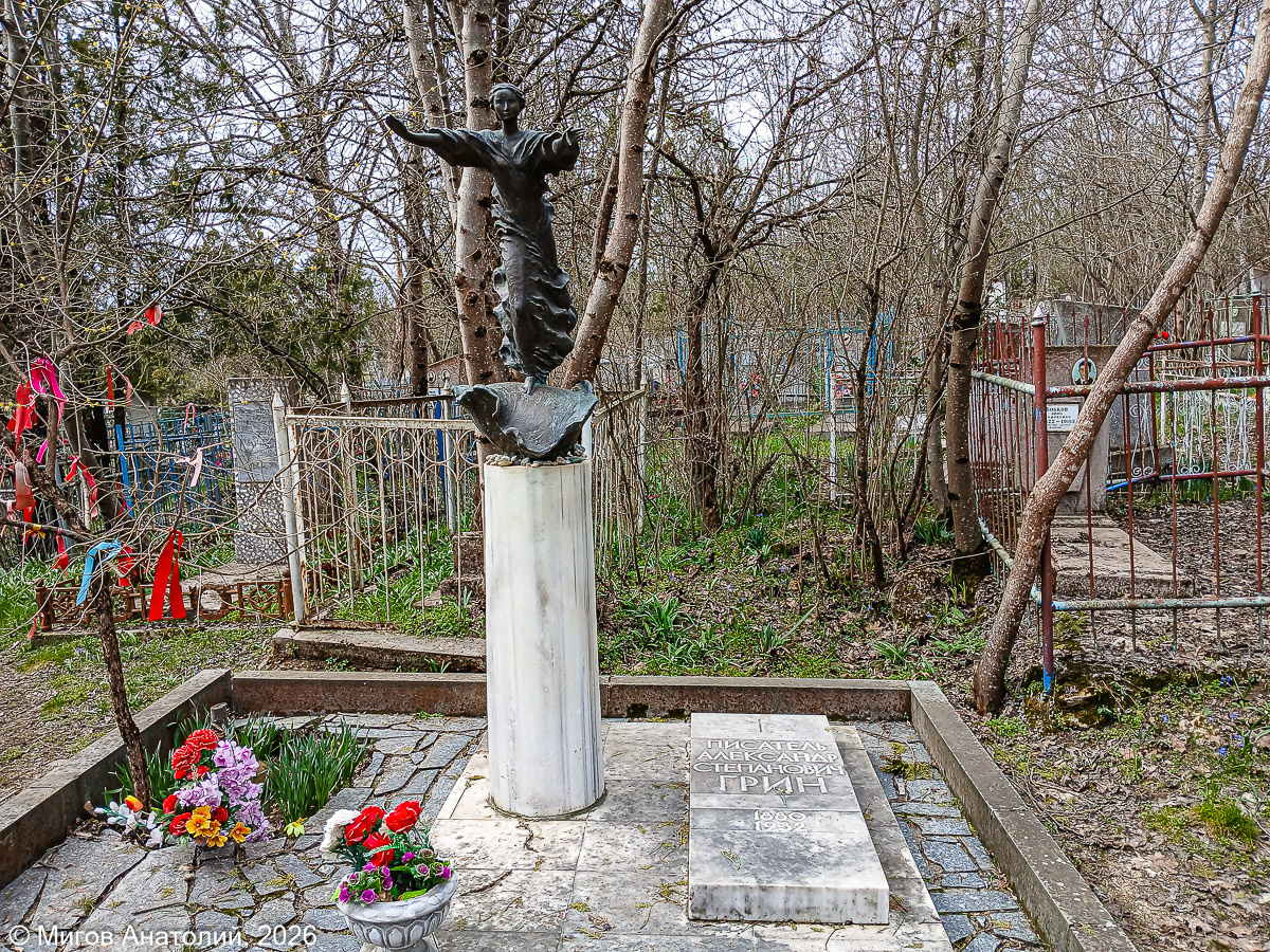 Писатель Александр Грин - автор знаменитых романов "Алые паруса" и "Бегущая по волнам" последние годы жизни провёл в Восточном Крыму. Сначала он жил в Феодосии, а затем перебрался в наш тихий городок Старый Крым. Здесь он и закончил свою жизнь, и был похоронен на местном кладбище. И хотя с тех прошло без малого сто лет, сюда не зарастает тропа поклонников светлых и трогательных книг Грина. Я уже рассказывал про это место. Когда мы с женой впервые, осенью 2012 г., приехали в Старый Крым, то сначала долго бродили по кладбищу в поисках могилы писателя. Но потом встретили на одной из дорожек группу крымских татар, которые объяснили нам, что найти Грина просто. Для этого надо зайти на кладбище через боковой вход, а там есть указатели. Мы вернулись к дороге, которая ведет из Феодосии в Симферополь через Старый Крым, и прошли вдоль неказистого забора, огораживающего Старокрымское кладбище. Легко нашли по описанию специальный вход, ведущий к могиле писателя. Информационный стенд появился уже