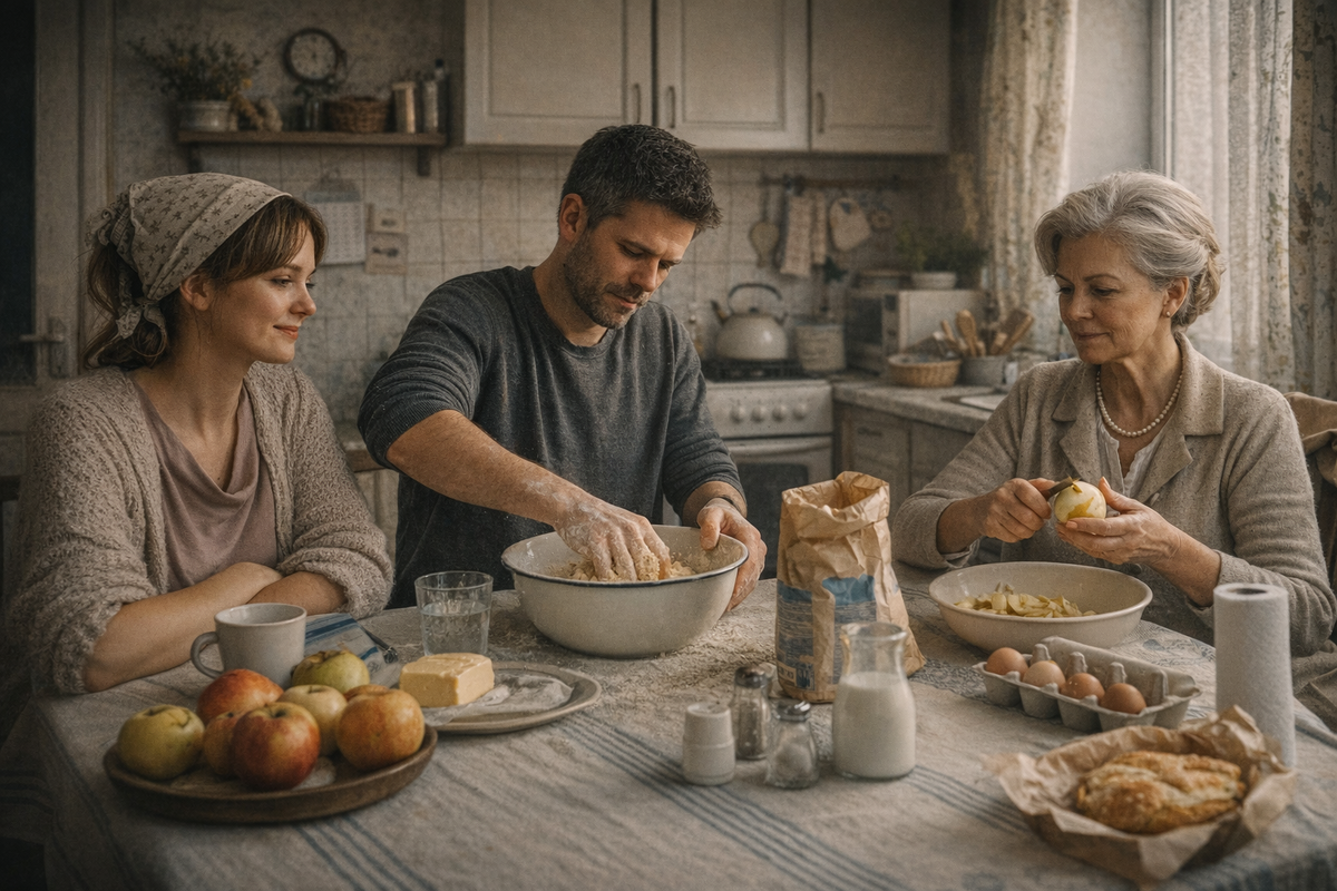 На столе лежала длинная яблочная кожура, скручиваясь светлой лентой. Люба месила тесто. Я держал миску, чтобы не скользила. Мать чистила второе яблоко медленнее, чем обычно, стараясь не прорезать глубоко.