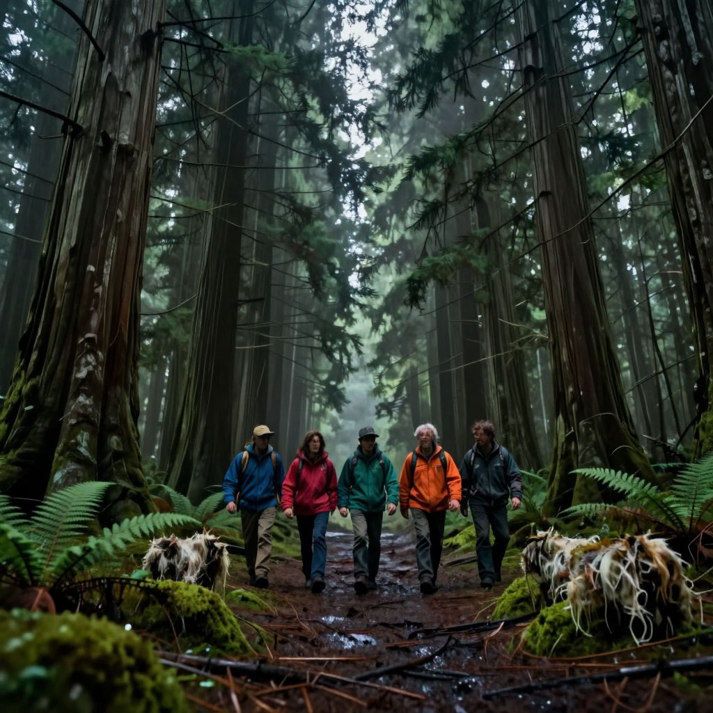 В глухих кедровых лесах на северо-западе Тихоокеанского побережья, где стволы деревьев смыкаются, словно стены древнего собора, а мрак опускается раньше, чем солнце касается горизонта, в 1970-х годах начали пропадать животные. Сначала охотники заметили, что белки и зайцы исчезают, оставляя за собой лишь клочья шерсти и тревожный треск веток. Потом пошли слухи: в чаще бродит нечто, что издаёт резкие, стрекочущие звуки, будто гигантский кузнечик скребёт по металлу. Лесники, патрулировавшие эти места, сперва отмахивались: мол, просто ветер или звери. Но вскоре они сами стали свидетелями необъяснимого. Группа из пяти лесников — Джон, Билл, Марта, Сэм и молодой стажёр Эдди — отправилась проверять кормушки для оленей. День выдался пасмурный, капли дождя оседали на хвое, превращая землю в скользкую губку. Они шли, переговариваясь, пока вдруг не услышали: трек-трек-трек — будто кто-то быстро щёлкал костяшками пальцев. Звук доносился из-за густых зарослей. Джон, самый опытный, велел всем остано