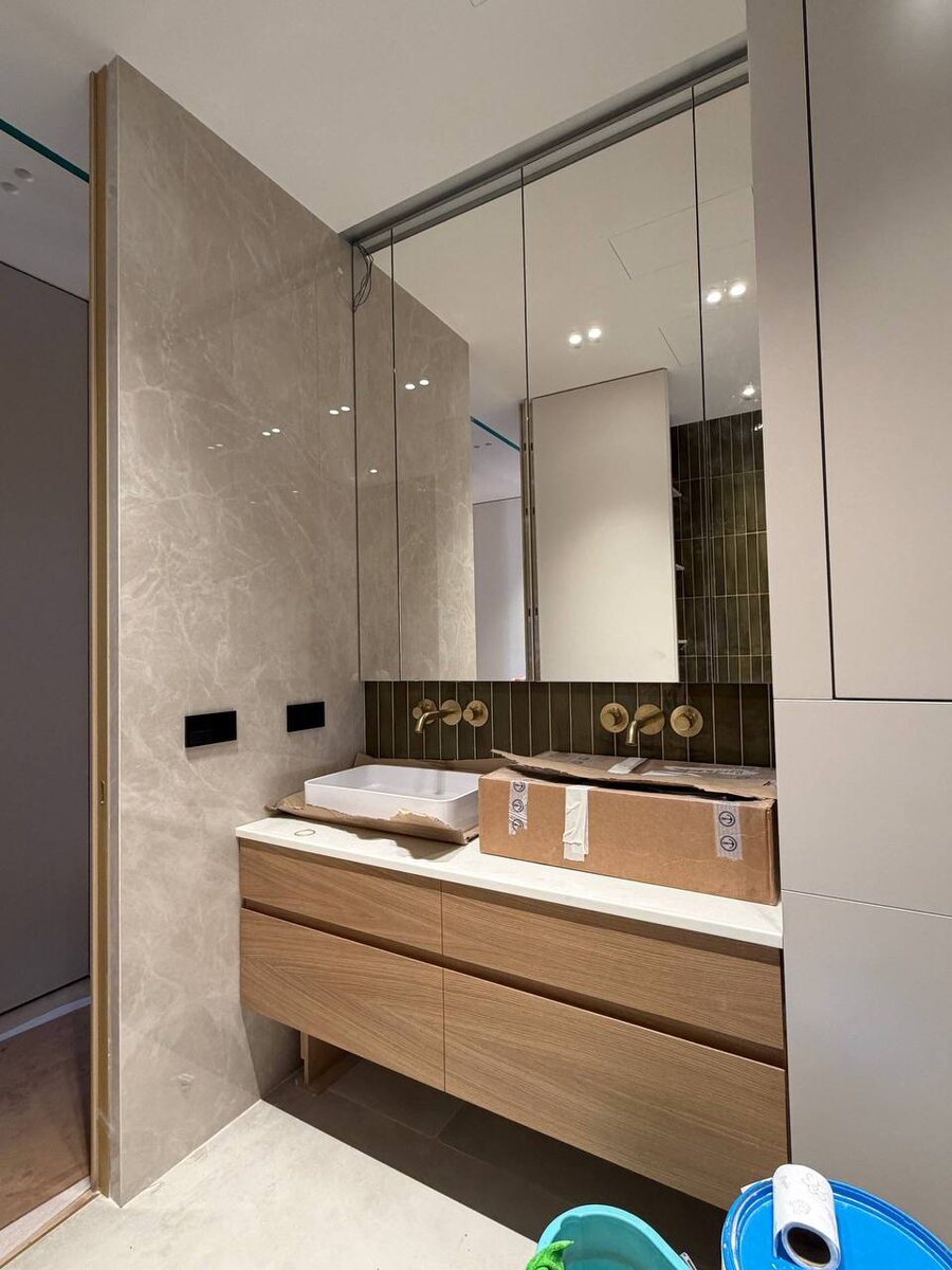 (а не просто красиво смотреть) Из проекта который показывала вам вчера Здесь мастер-ванная И она изначально собиралась не как «композиция», а как пространство для двоих Чтобы не было ситуации, когда один подстраивается под другого У каждого — своя зона Своя раковина, своё хранение, своё место Снизу — несколько ящиков под раковинами Не один большой, а именно разделённые — так гораздо удобнее в жизни Сверху кажется, что это просто зеркало Но за ним полноценное хранение Открывается снизу, лёгким захватом рукой — внутри полки под повседневные вещи, которые не хочется оставлять на виду Ещё здесь будет подсветка зеркала — мягкий свет, который не бьёт в глаза и не даёт жёстких теней Такие вещи обычно не видны на фото, но очень ощущаются в жизни Из деталей, которые я люблю — электрика В этом проекте используем серию Simon 100 Широкие клавиши, очень тактильные, и визуально они собирают плоскость, а не дробят её Розетки — с влагозащитой, с поворотной шторкой И это тоже про удобство