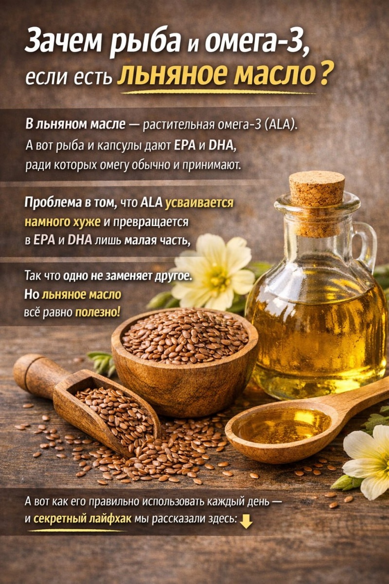 ? На этом вопросе многие и спотыкаются. Потому что кажется: если в льняном масле тоже есть омега, значит, можно просто пить его и не заморачиваться. Но не всё так просто. Да, в льняном масле есть омега-3. Только это растительная форма — ALA. А вот в рыбе и хороших добавках — EPA и DHA. Именно ради них омегу обычно и принимают. В чём нюанс? Организму мало просто получить ALA — её ещё нужно превратить в EPA и DHA. А этот процесс у человека идёт ограниченно и не очень эффективно. Поэтому льняное масло не заменяет ни рыбу, ни качественную омега-3. Но и списывать его со счетов точно не стоит. Как источник полезных жиров на каждый день оно вполне может быть хорошей частью рациона. Главное — использовать его правильно. Потому что у льняного масла есть свои тонкости и в хранении, и в употреблении. Кстати, у нас для вас есть лайфхак с льняным маслом, о котором вы, скорее всего, не слышали. Продолжение читайте здесь